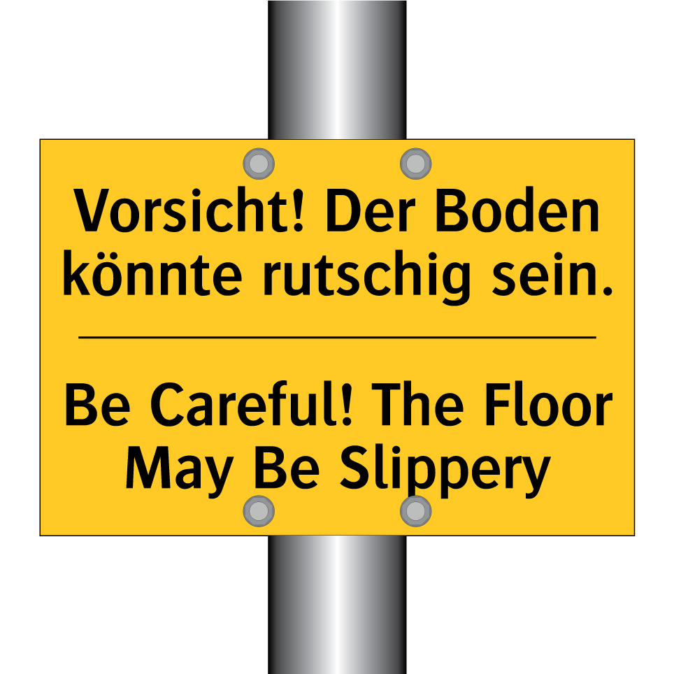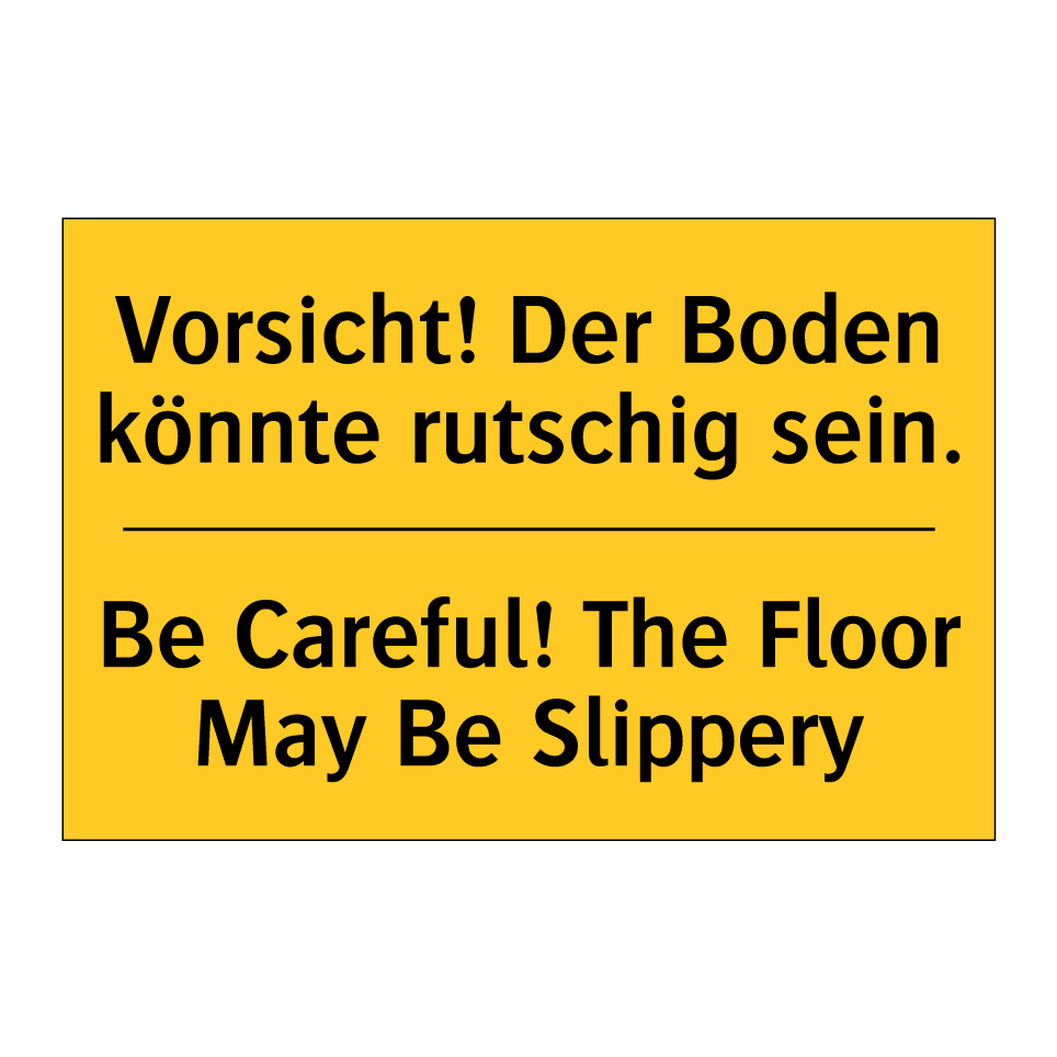 Zweisprachiges Warnschild mit deutschem Text Vorsicht! Der Boden könnte rutschig sein. und englischem Text Be Careful! The Floor May Be Slippery