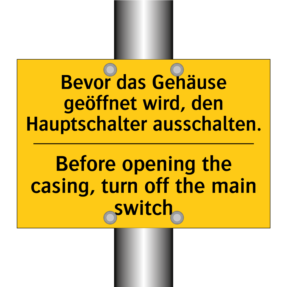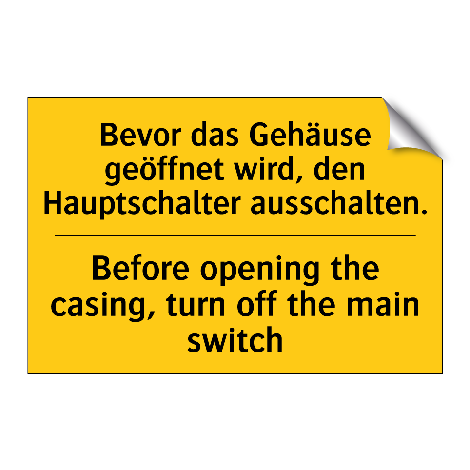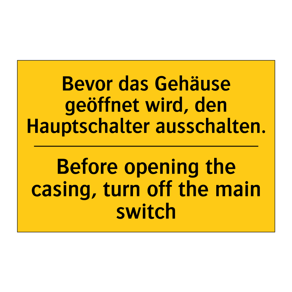 Zweisprachiges Warnschild mit deutschem Text Bevor das Gehäuse geöffnet wird, den Hauptschalter ausschalten. und englischem Text Before opening the casing, turn off the main switch