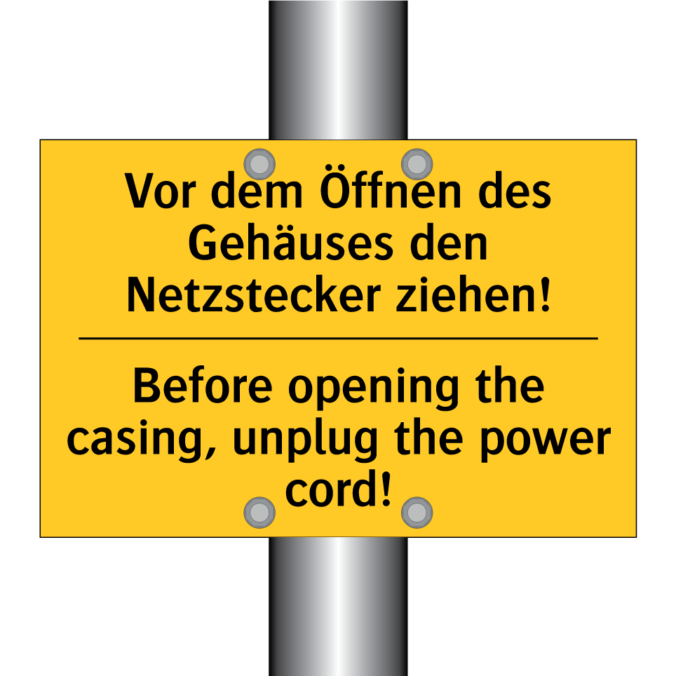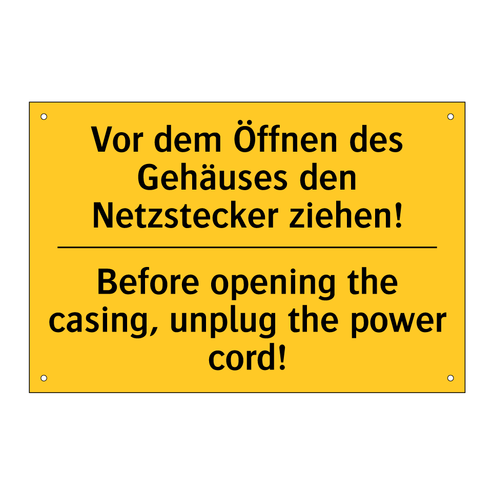 Zweisprachiges Warnschild mit deutschem Text Vor dem Öffnen des Gehäuses den Netzstecker ziehen! und englischem Text Before opening the casing, unplug the power cord!