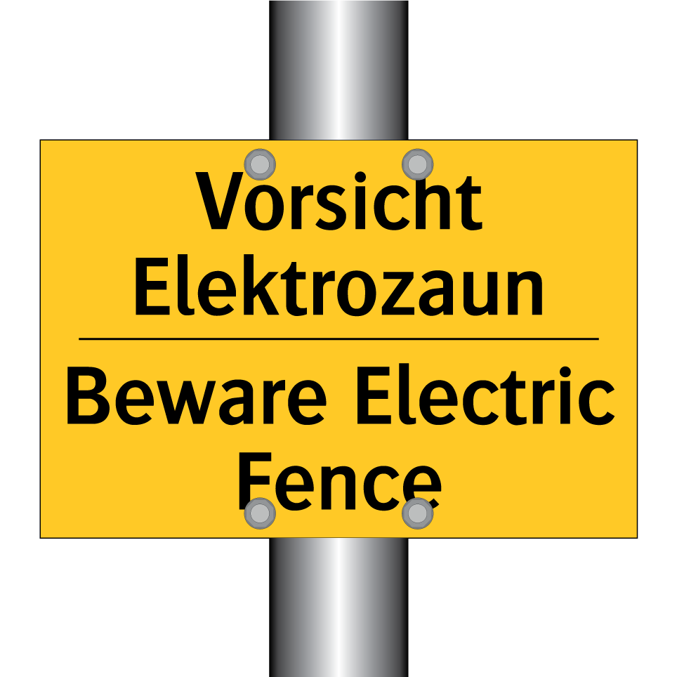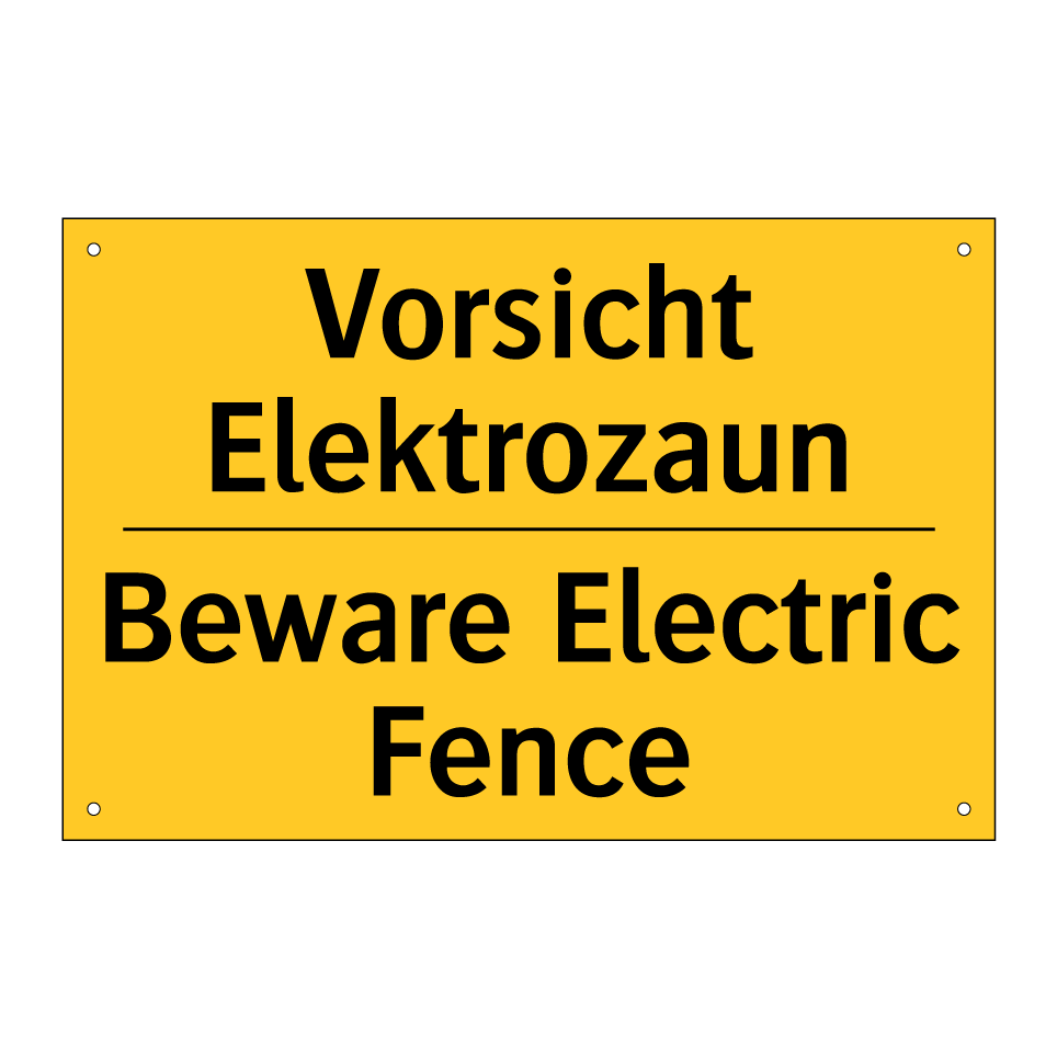 Zweisprachiges Warnschild mit deutschem Text Vorsicht Elektrozaun und englischem Text Beware Electric Fence