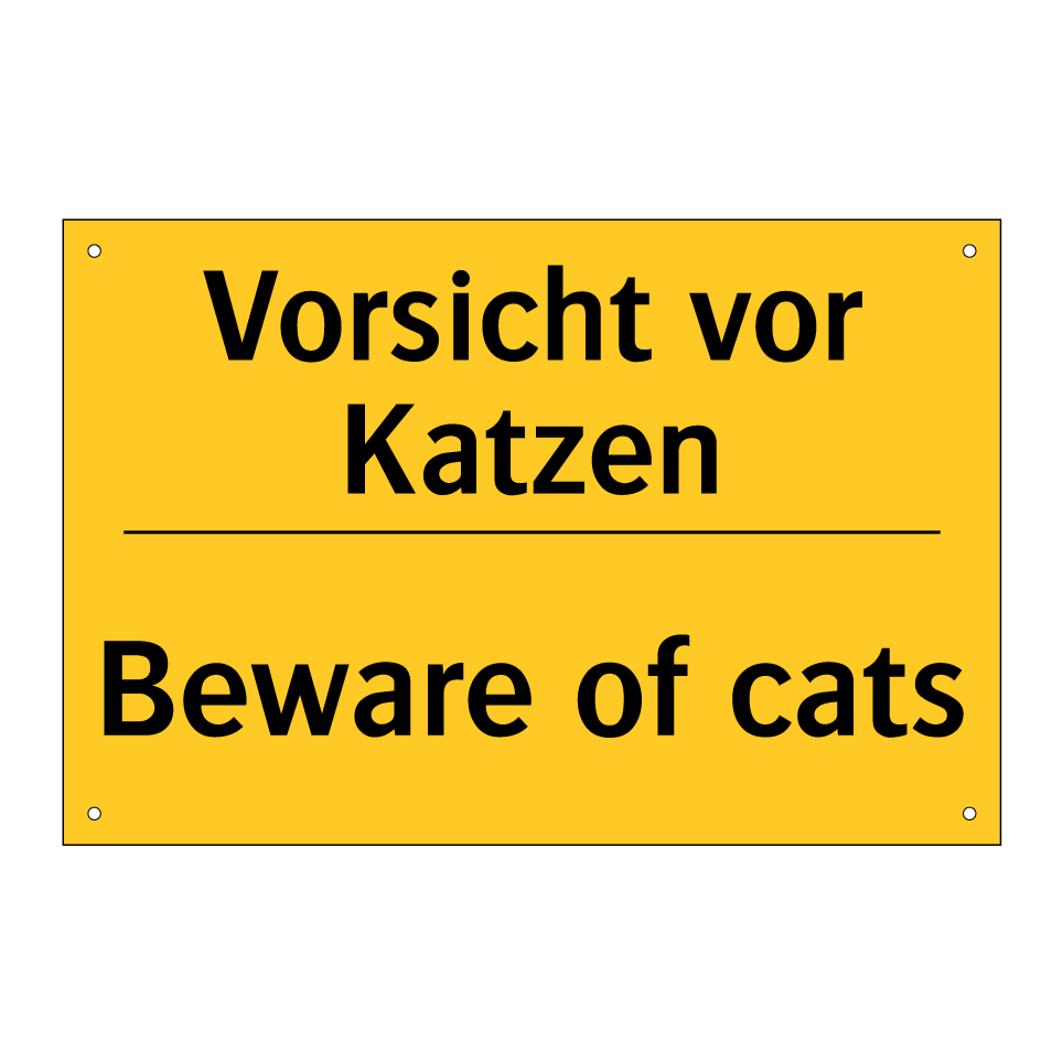 Zweisprachiges Warnschild mit deutschem Text Vorsicht vor Katzen und englischem Text Beware of cats