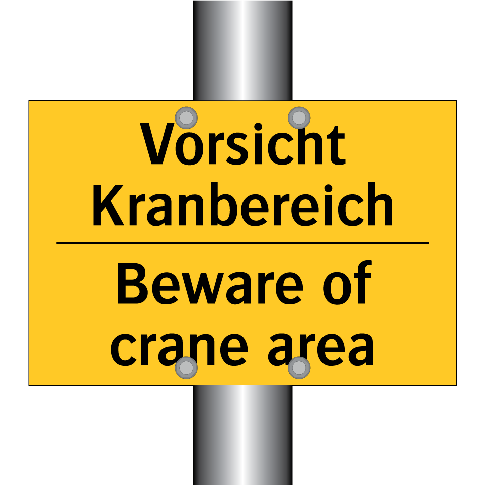 Zweisprachiges Warnschild mit deutschem Text Vorsicht Kranbereich und englischem Text Beware of crane area