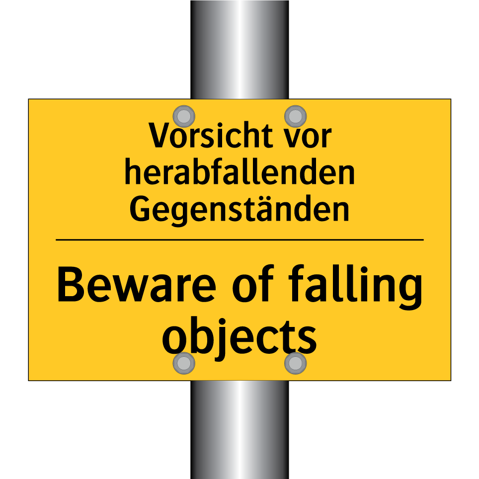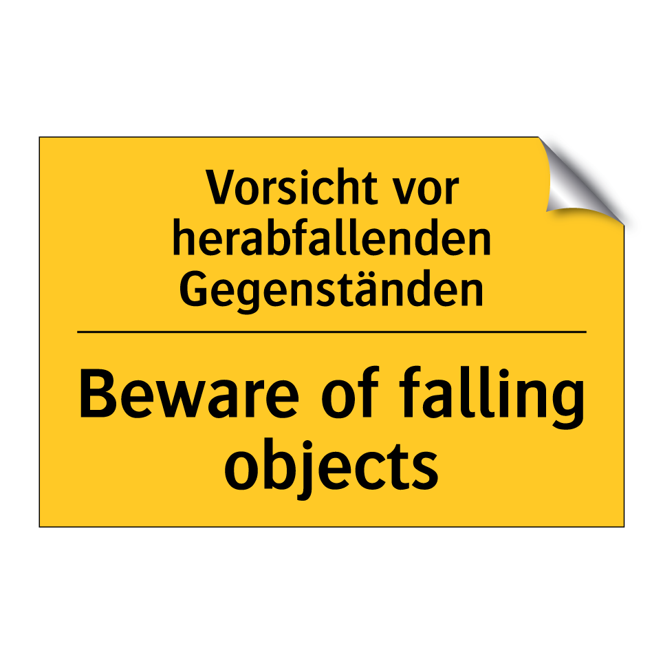 Zweisprachiges Warnschild mit deutschem Text Vorsicht vor herabfallenden Gegenständen und englischem Text Beware of falling objects