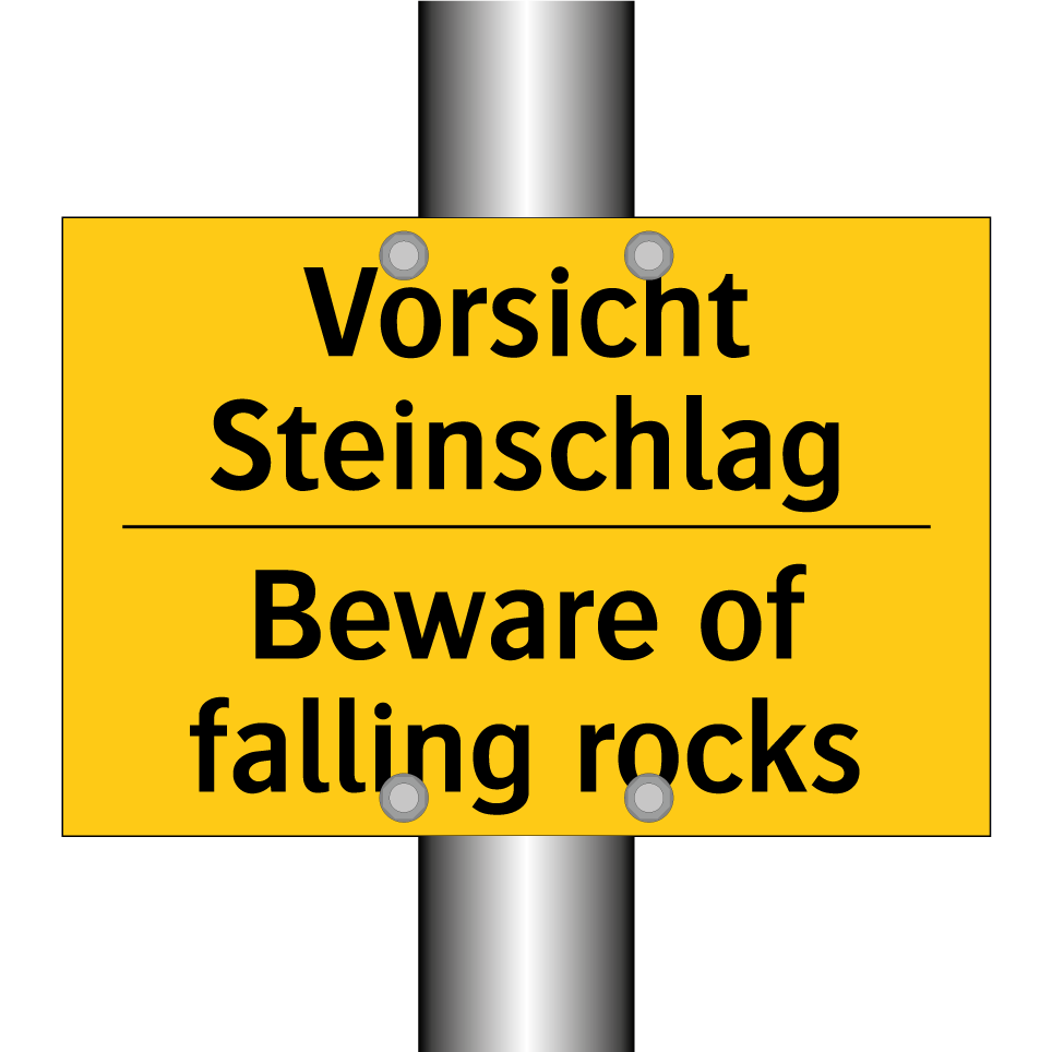 Zweisprachiges Warnschild mit deutschem Text Vorsicht Steinschlag und englischem Text Beware of falling rocks