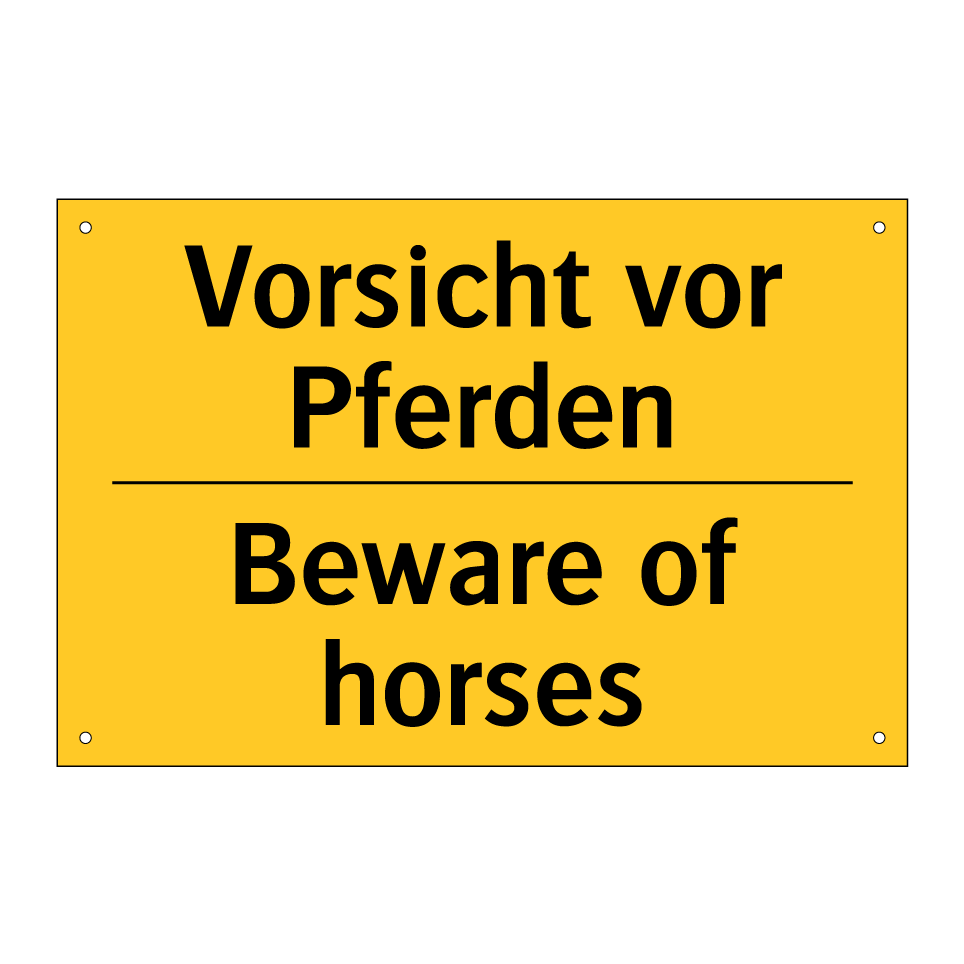 Diese zweisprachige Warnschild mit gelbem Hintergrund und schwarzem Text ist ideal, um auf die Anwesenheit von Pferden aufmerksam zu machen. Dank der Beschriftung in Deutsch und Englisch eignet sich das Schild hervorragend für internationale Umgebungen, in denen sowohl deutsch- als auch englischsprachige Personen unterwegs sind. Es kann an Reitställen, Pferdekoppeln oder entlang von Reitwegen platziert werden, um Passanten und Autofahrer zu warnen und die Sicherheit zu erhöhen. Die klare und deutliche Botschaft sorgt dafür, dass jeder die notwendige Vorsicht walten lässt. Nutzen Sie diese Warnschilder, um Unfälle zu vermeiden und die Sicherheit in Bereichen mit Pferdeverkehr zu gewährleisten.