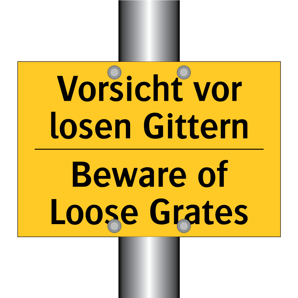Zweisprachiges Warnschild mit deutschem Text Vorsicht vor losen Gittern und englischem Text Beware of Loose Grates