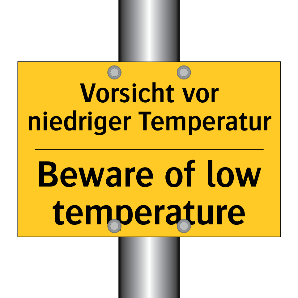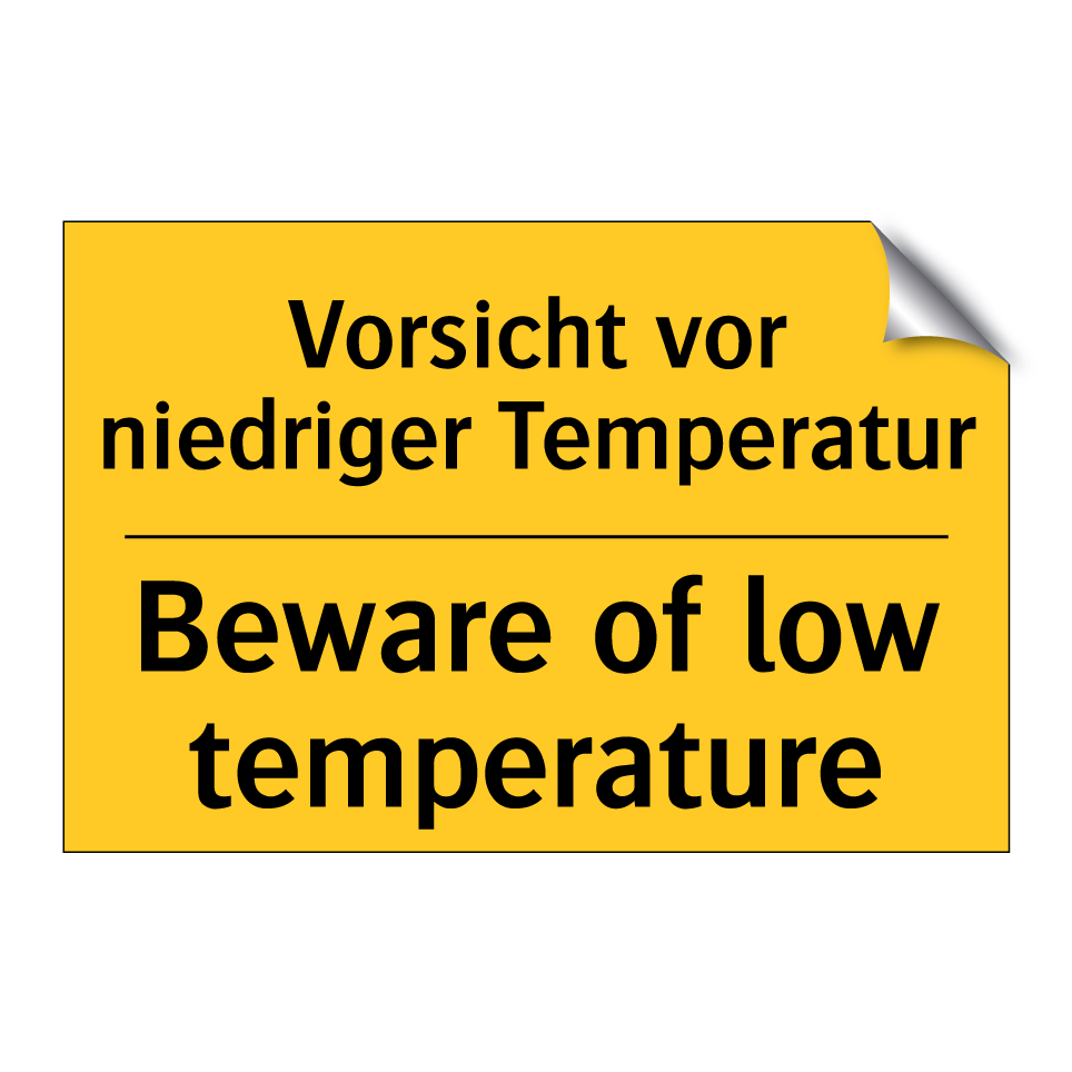 Zweisprachiges Warnschild mit deutschem Text Vorsicht vor niedriger Temperatur und englischem Text Beware of low temperature