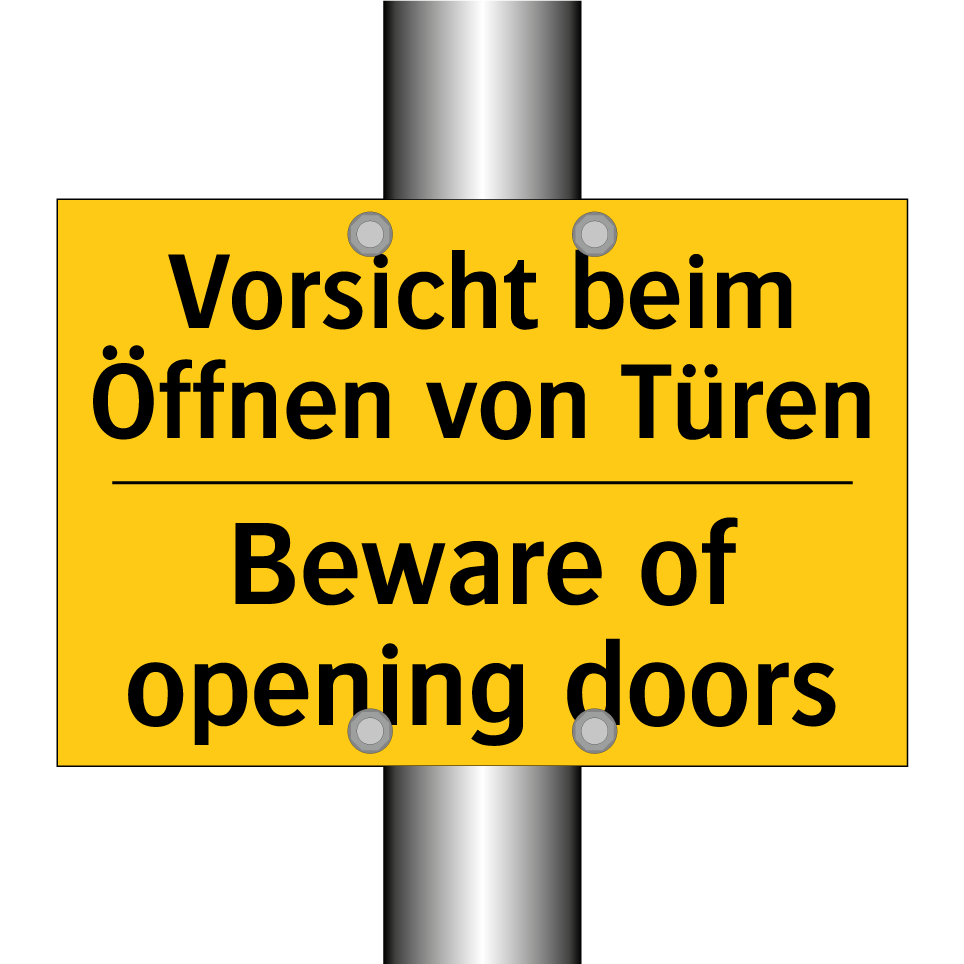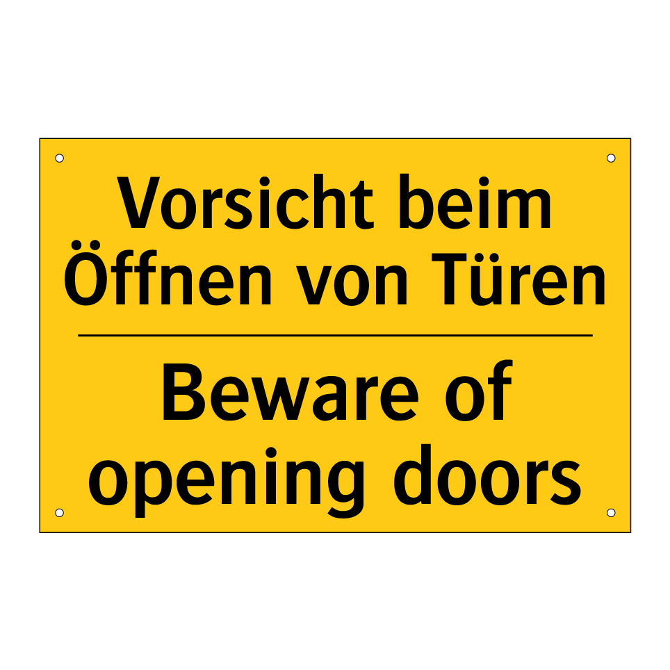 Zweisprachiges Warnschild mit deutschem Text Vorsicht beim Öffnen von Türen und englischem Text Beware of opening doors