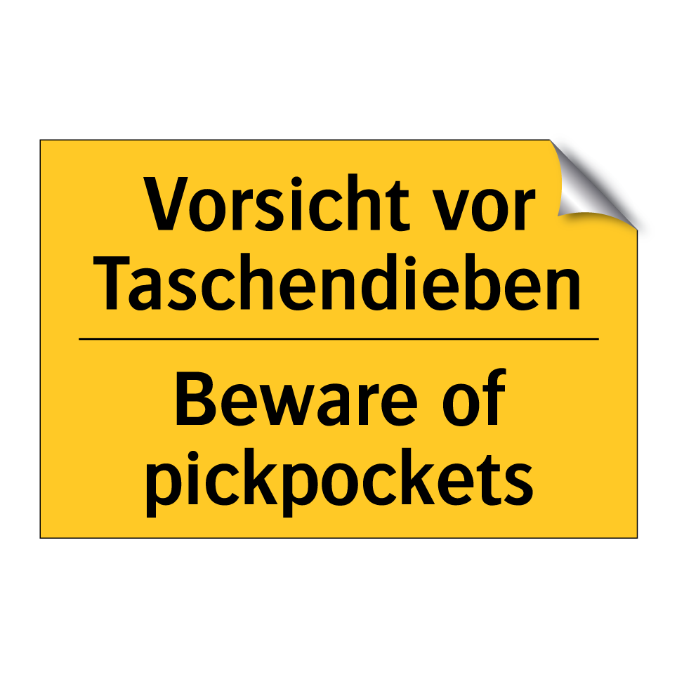 Zweisprachiges Warnschild mit deutschem Text Vorsicht vor Taschendieben und englischem Text Beware of pickpockets