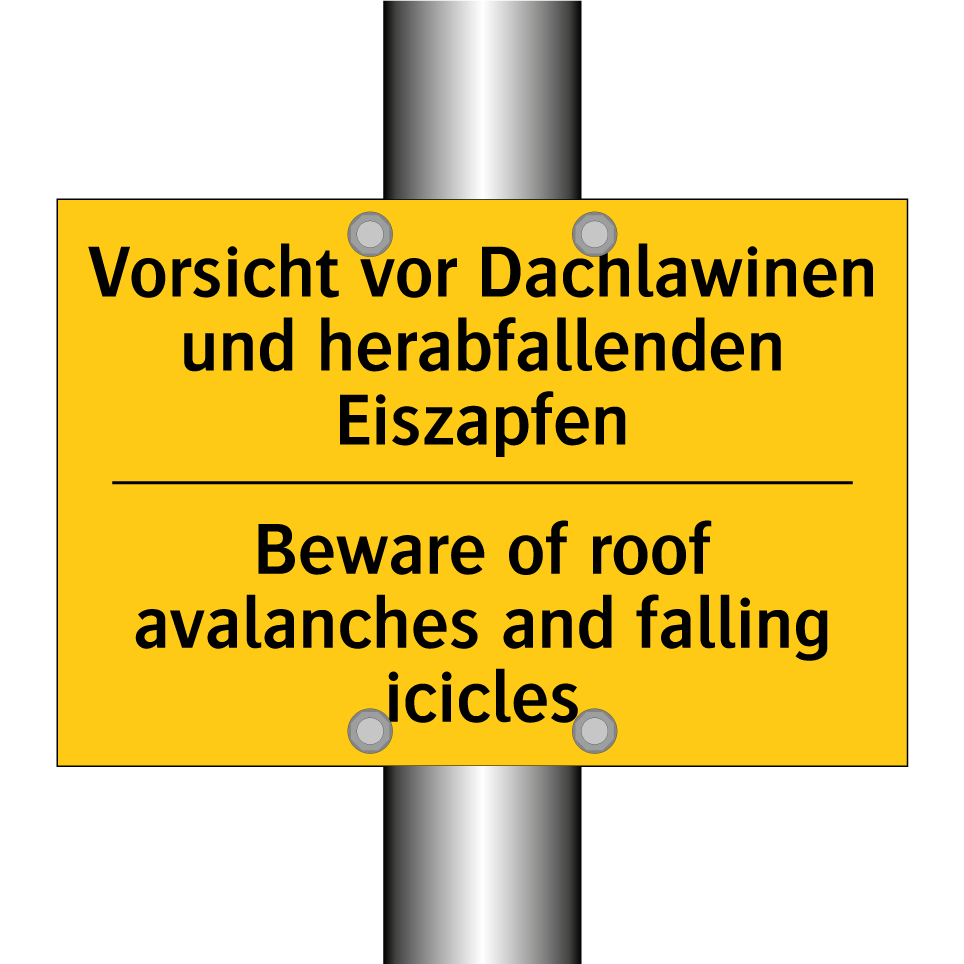 Zweisprachiges Warnschild mit deutschem Text Vorsicht vor Dachlawinen und herabfallenden Eiszapfen und englischem Text Beware of roof avalanches and falling icicles