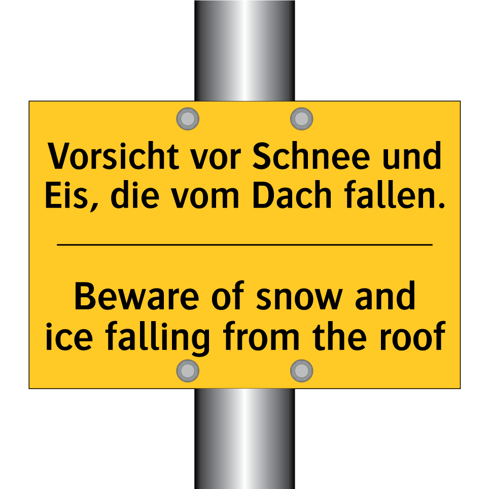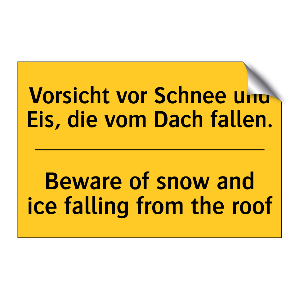 Zweisprachiges Warnschild mit deutschem Text Vorsicht vor Schnee und Eis, die vom Dach fallen. und englischem Text Beware of snow and ice falling from the roof
