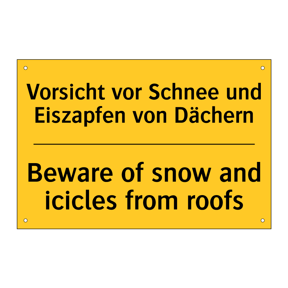 Zweisprachiges Warnschild mit deutschem Text Vorsicht vor Schnee und Eiszapfen von Dächern und englischem Text Beware of snow and icicles from roofs