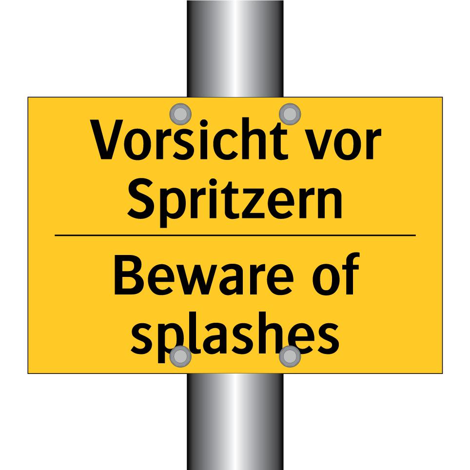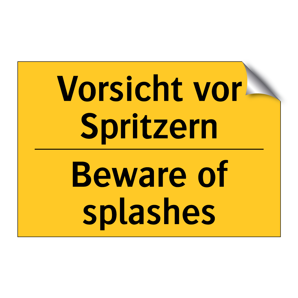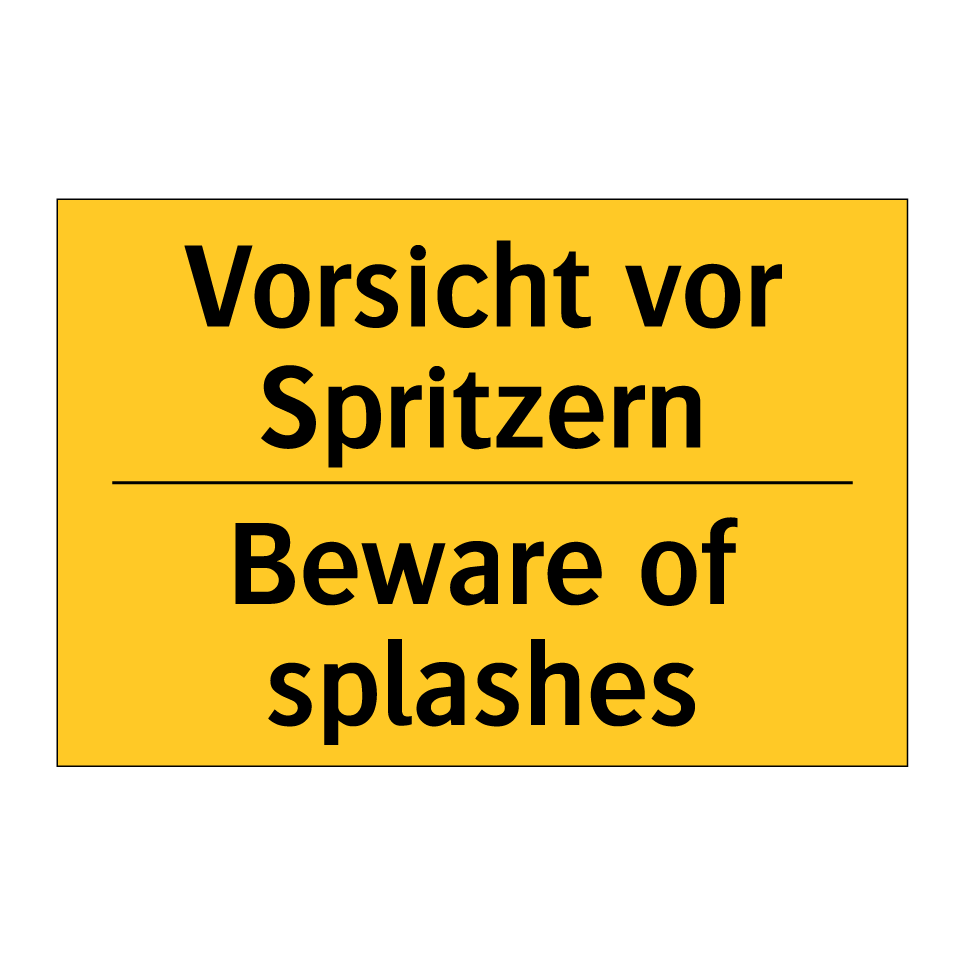 Zweisprachiges Warnschild mit deutschem Text Vorsicht vor Spritzern und englischem Text Beware of splashes