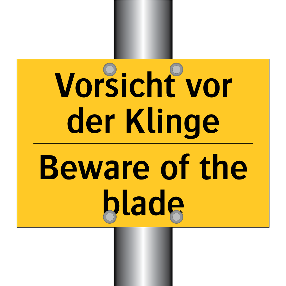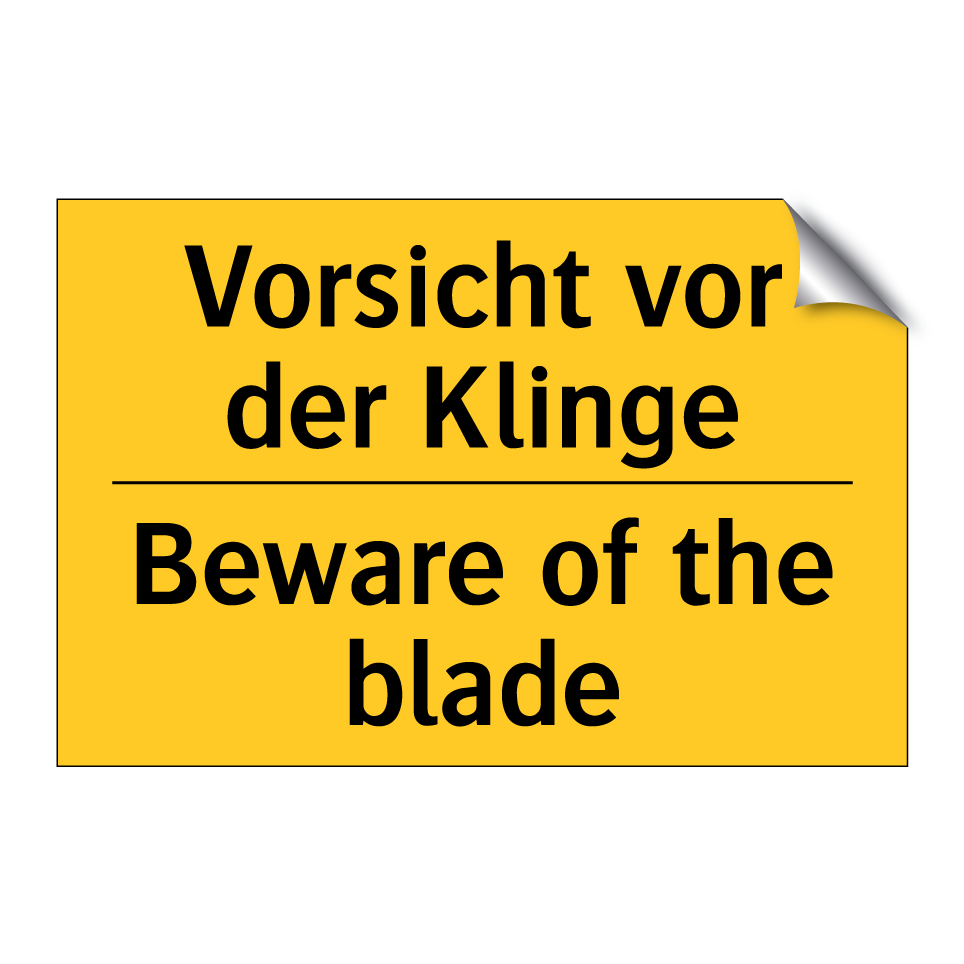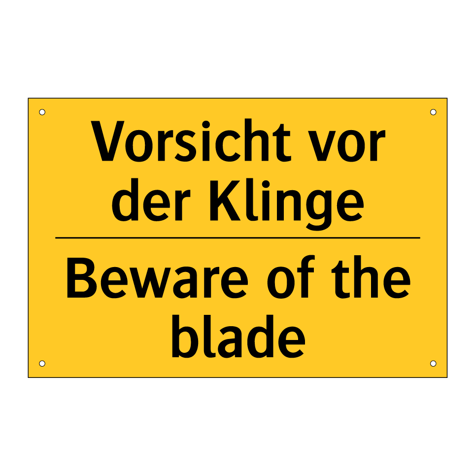 Zweisprachiges Warnschild mit deutschem Text Vorsicht vor der Klinge und englischem Text Beware of the blade