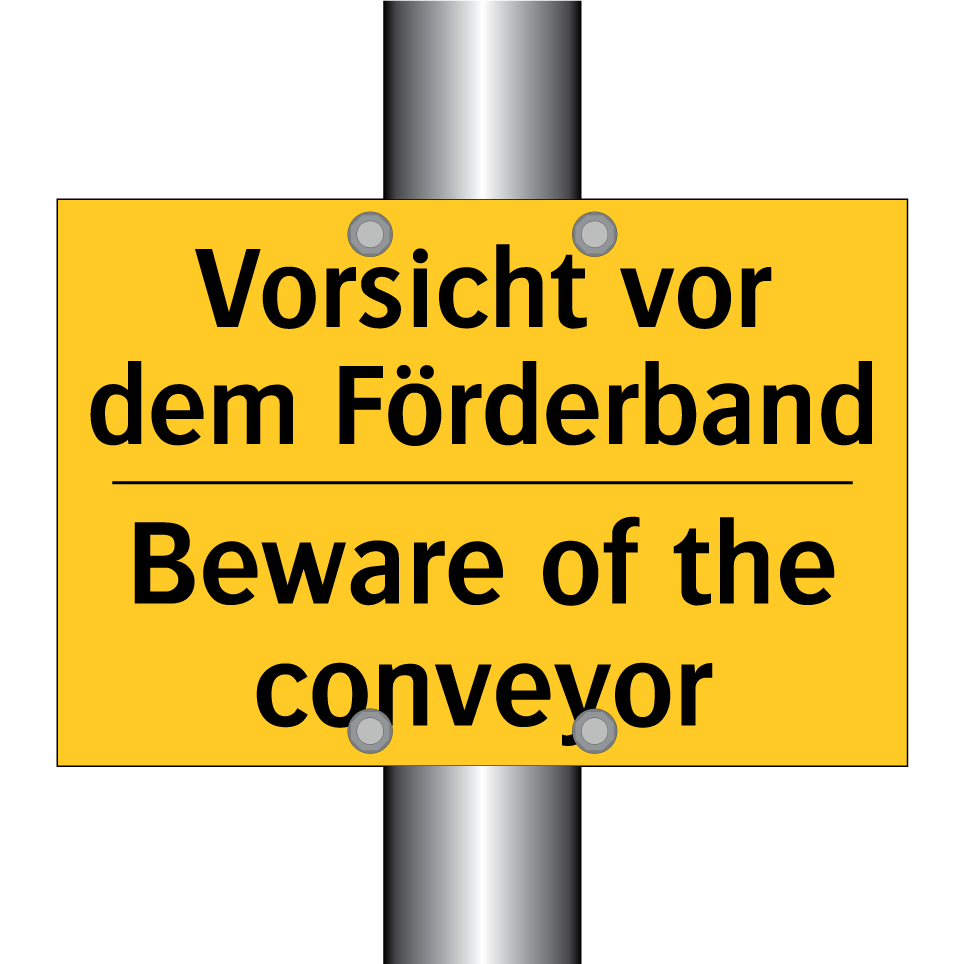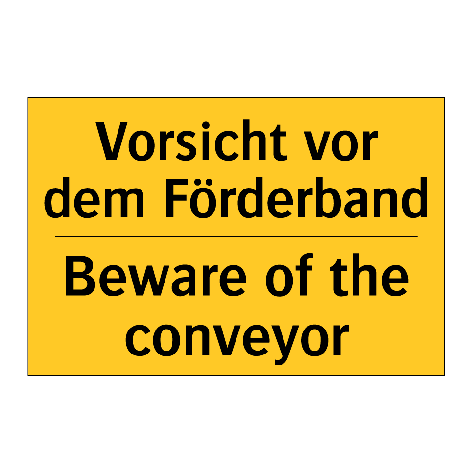 Zweisprachiges Warnschild mit deutschem Text Vorsicht vor dem Förderband und englischem Text Beware of the conveyor