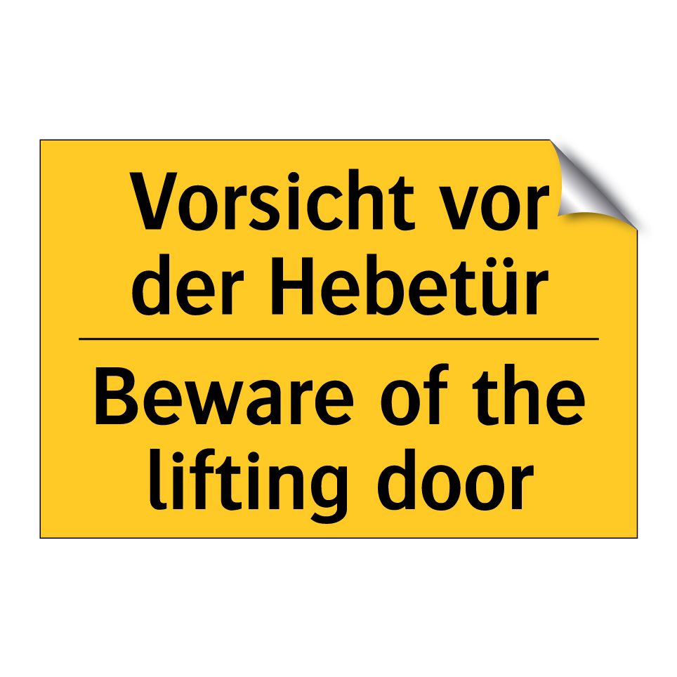 Zweisprachiges Warnschild mit deutschem Text Vorsicht vor der Hebetür und englischem Text Beware of the lifting door