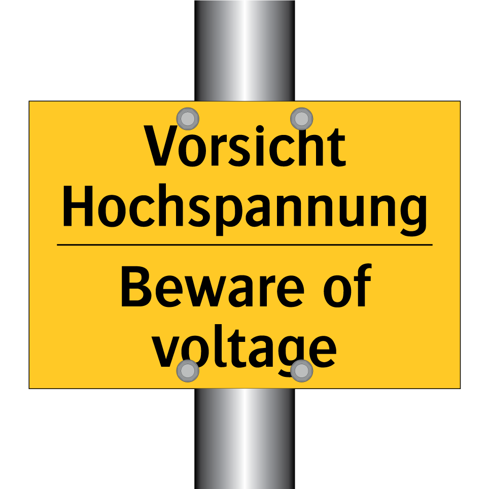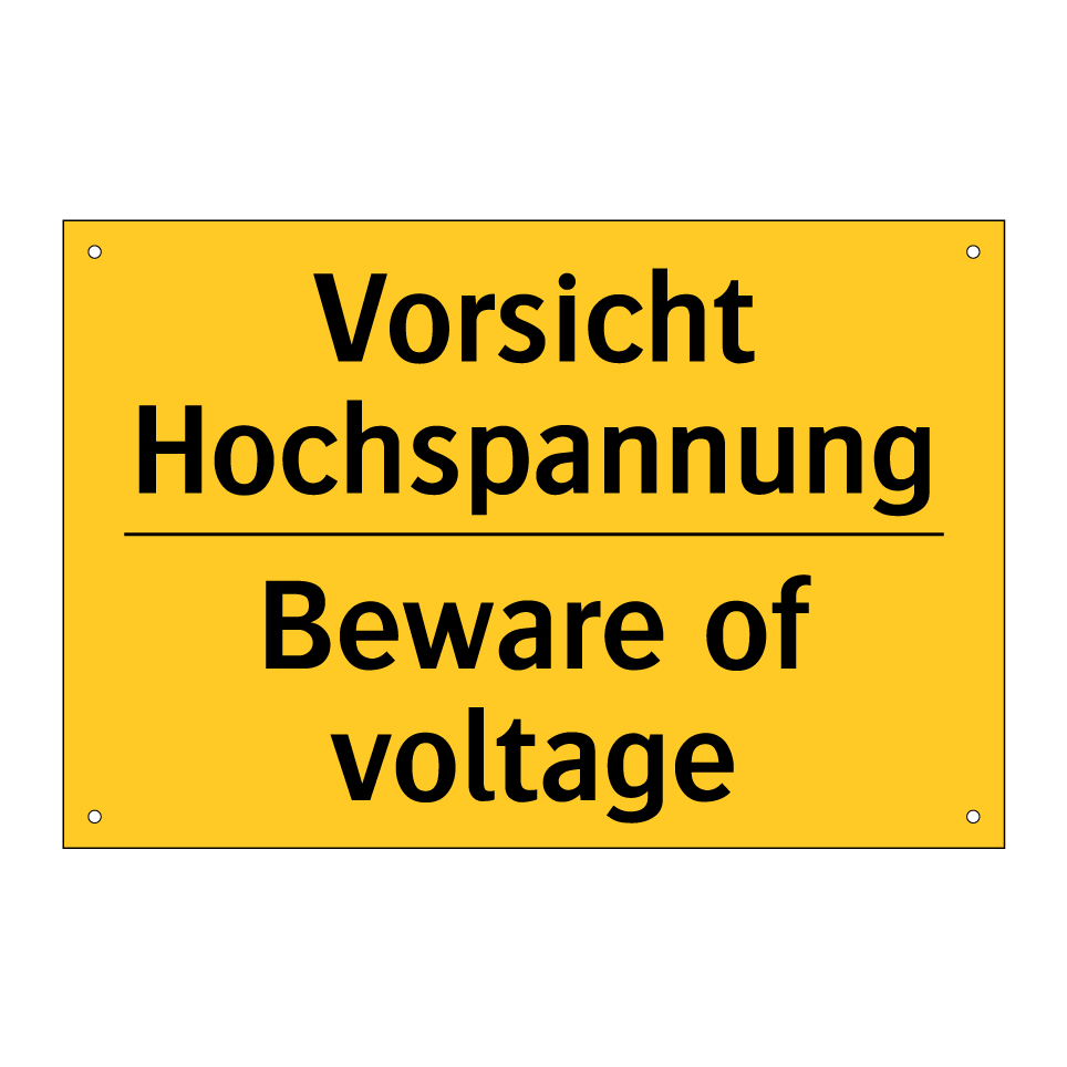 Zweisprachiges Warnschild mit deutschem Text Vorsicht Hochspannung und englischem Text Beware of voltage