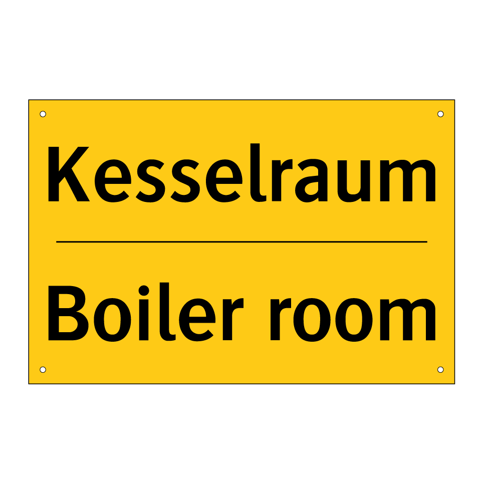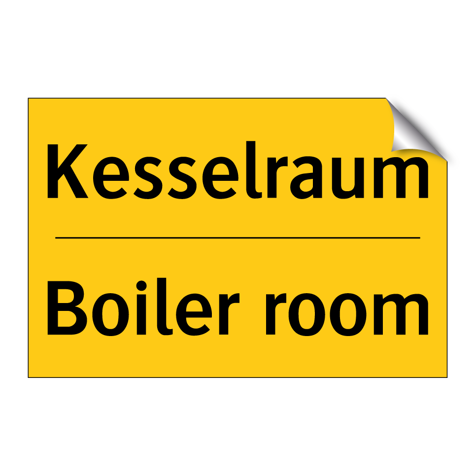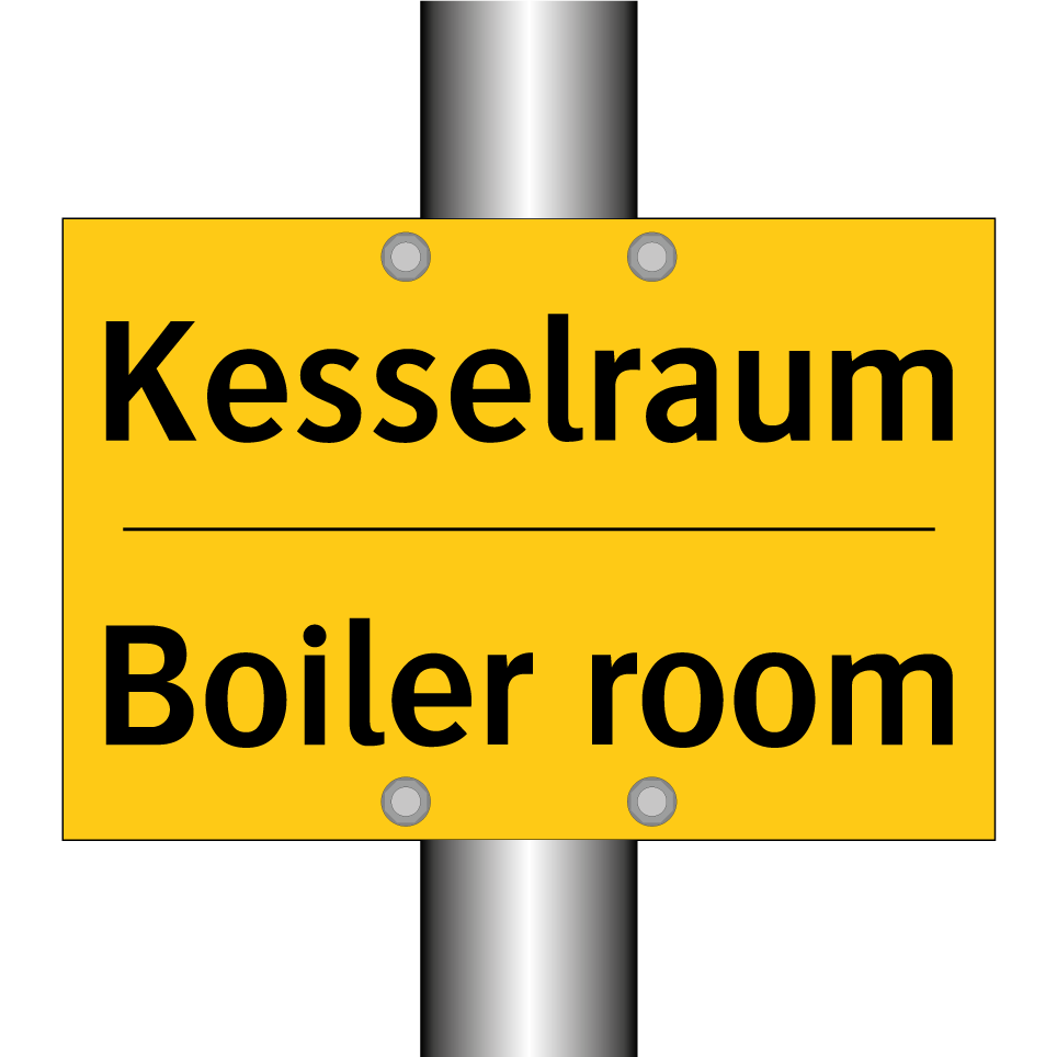 Zweisprachiges Warnschild mit deutschem Text Kesselraum und englischem Text Boiler room