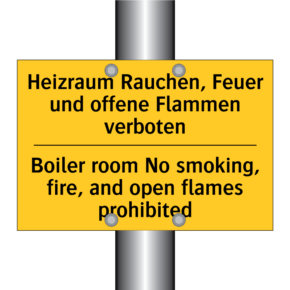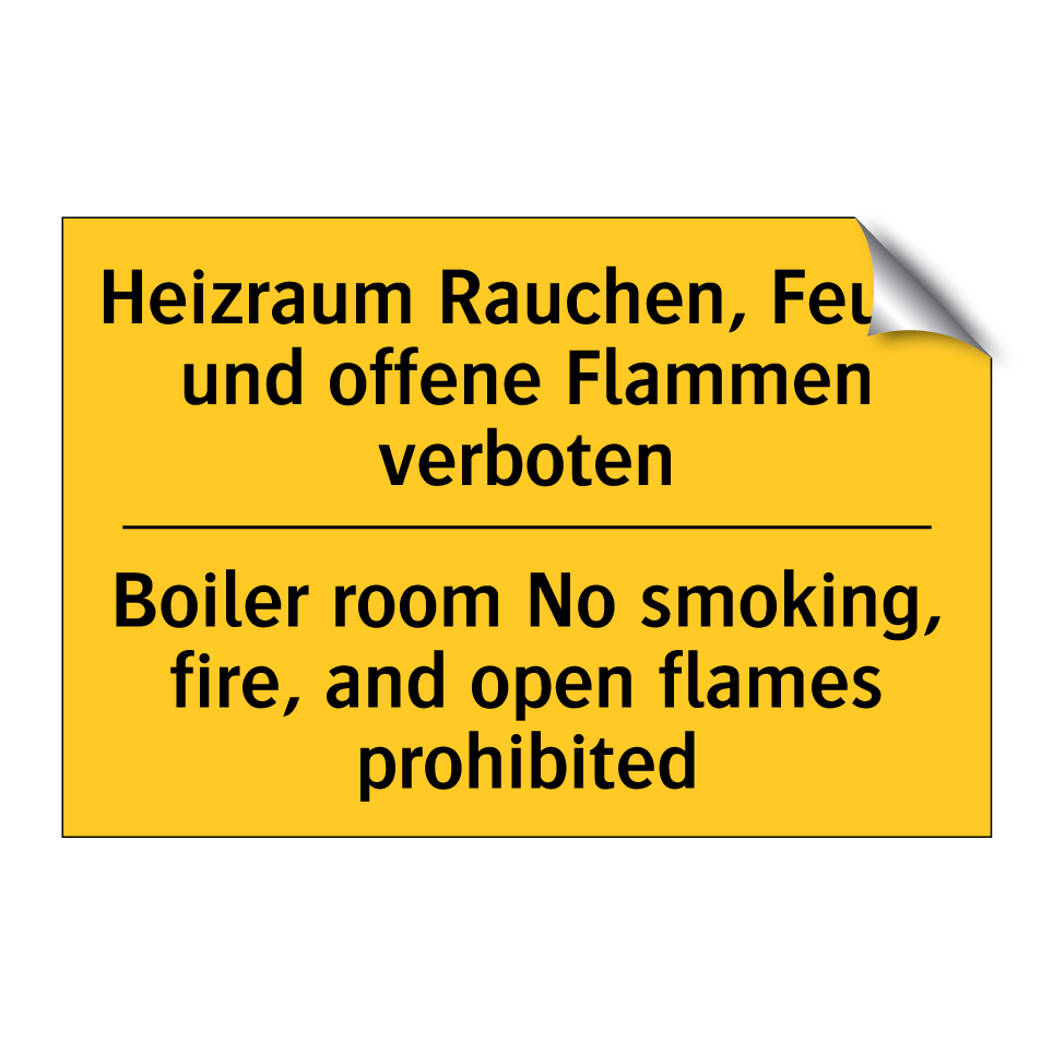 Zweisprachiges Warnschild mit deutschem Text Heizraum Rauchen, Feuer und offene Flammen verboten und englischem Text Boiler room No smoking, fire, and open flames prohibited