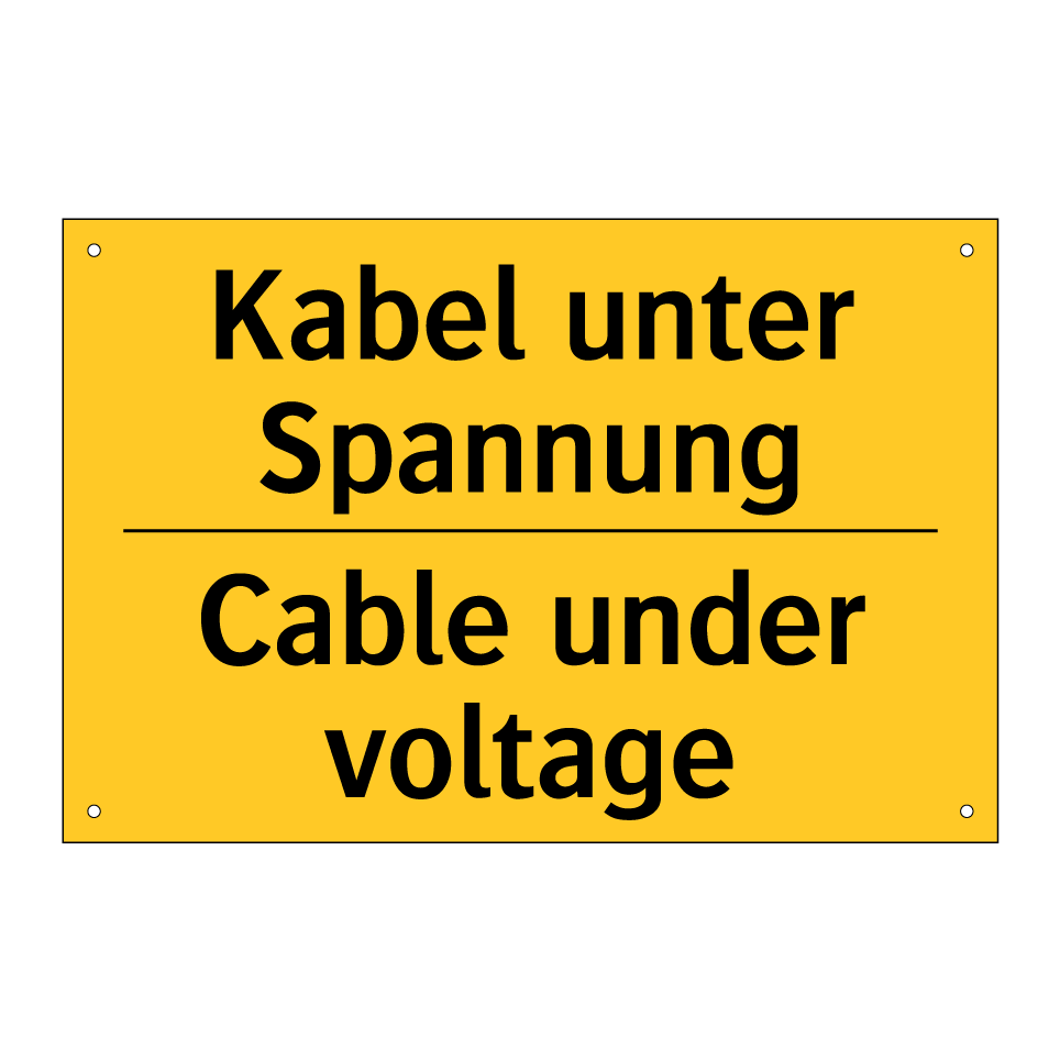Zweisprachiges Warnschild mit deutschem Text Kabel unter Spannung und englischem Text Cable under voltage