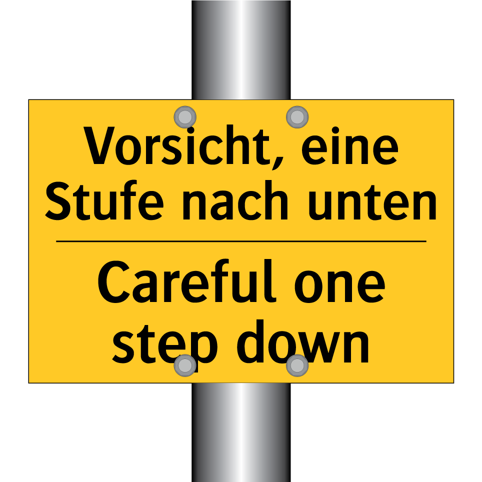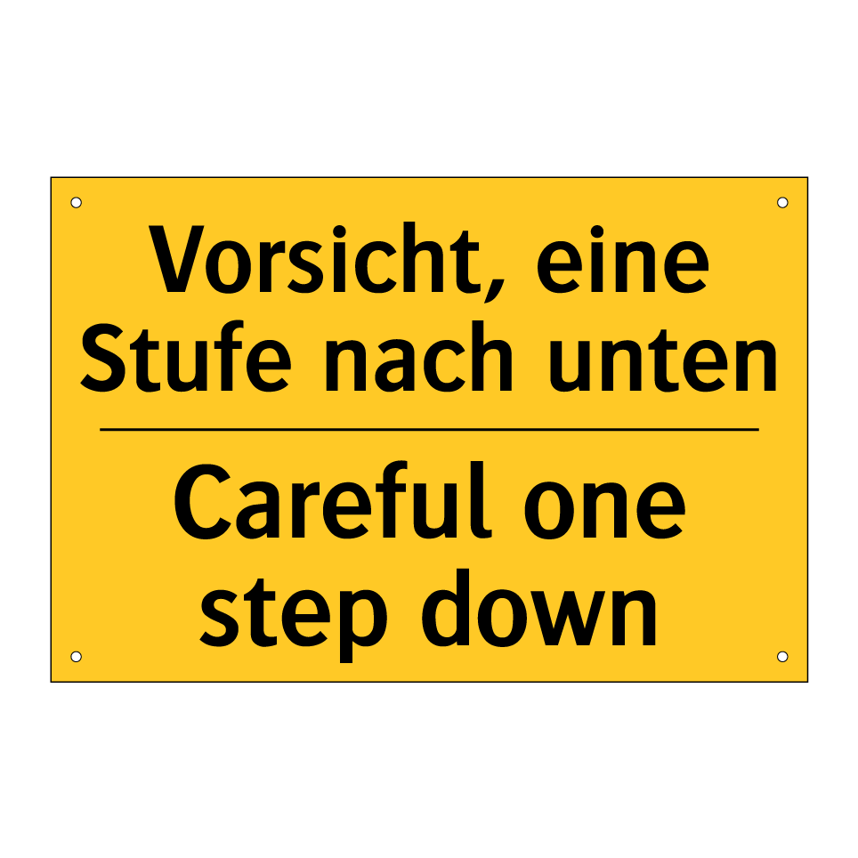 Zweisprachiges Warnschild mit deutschem Text Vorsicht, eine Stufe nach unten und englischem Text Careful one step down