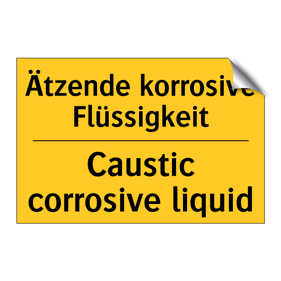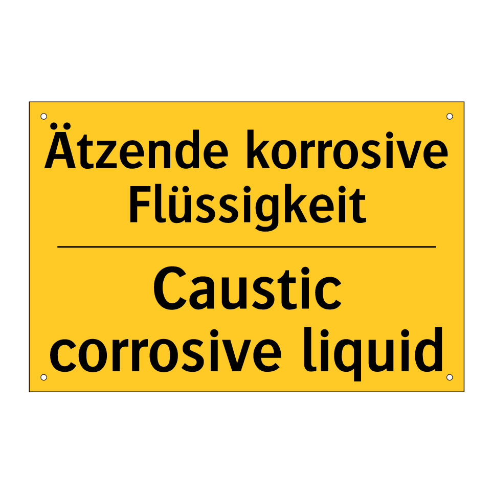 Zweisprachiges Warnschild mit deutschem Text Ätzende korrosive Flüssigkeit und englischem Text Caustic corrosive liquid