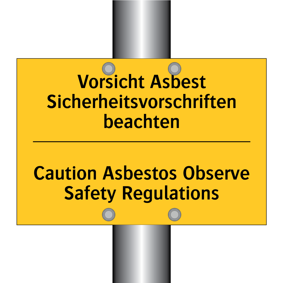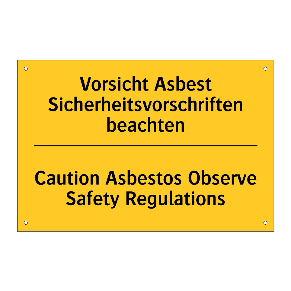 Zweisprachiges Warnschild mit deutschem Text Vorsicht Asbest Sicherheitsvorschriften beachten und englischem Text Caution Asbestos Observe Safety Regulations