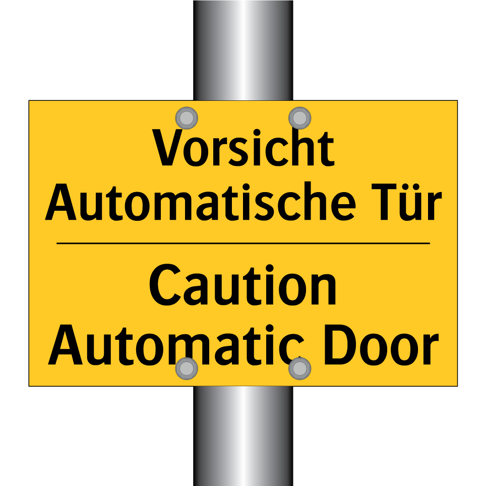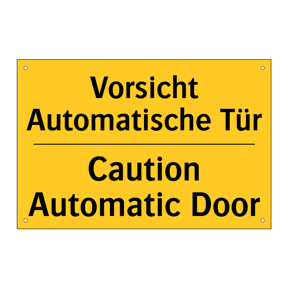 Zweisprachiges Warnschild mit deutschem Text Vorsicht Automatische Tür und englischem Text Caution Automatic Door
