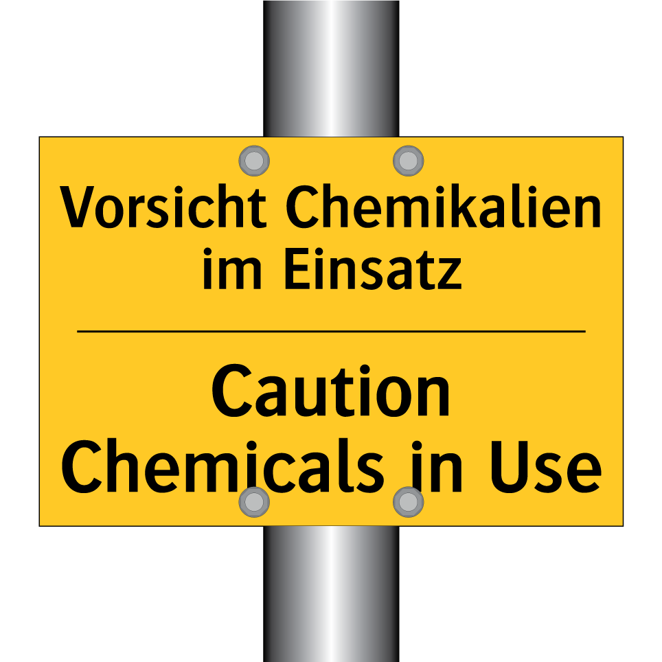 Zweisprachiges Warnschild mit deutschem Text Vorsicht Chemikalien im Einsatz und englischem Text Caution Chemicals in Use