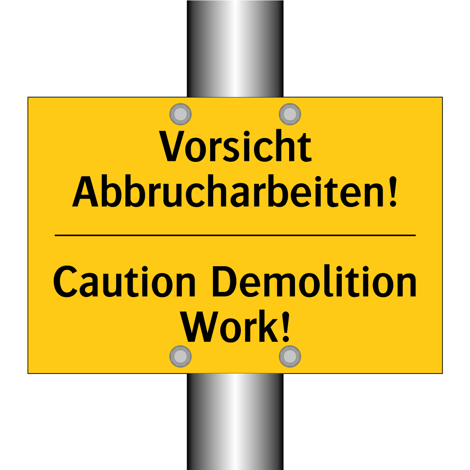 Zweisprachiges Warnschild mit deutschem Text Vorsicht Abbrucharbeiten! und englischem Text Caution Demolition Work!