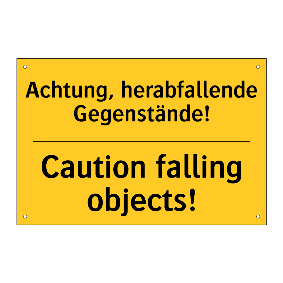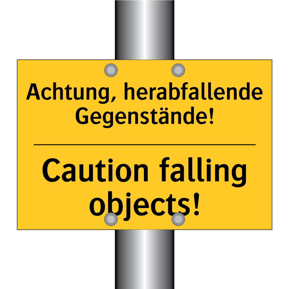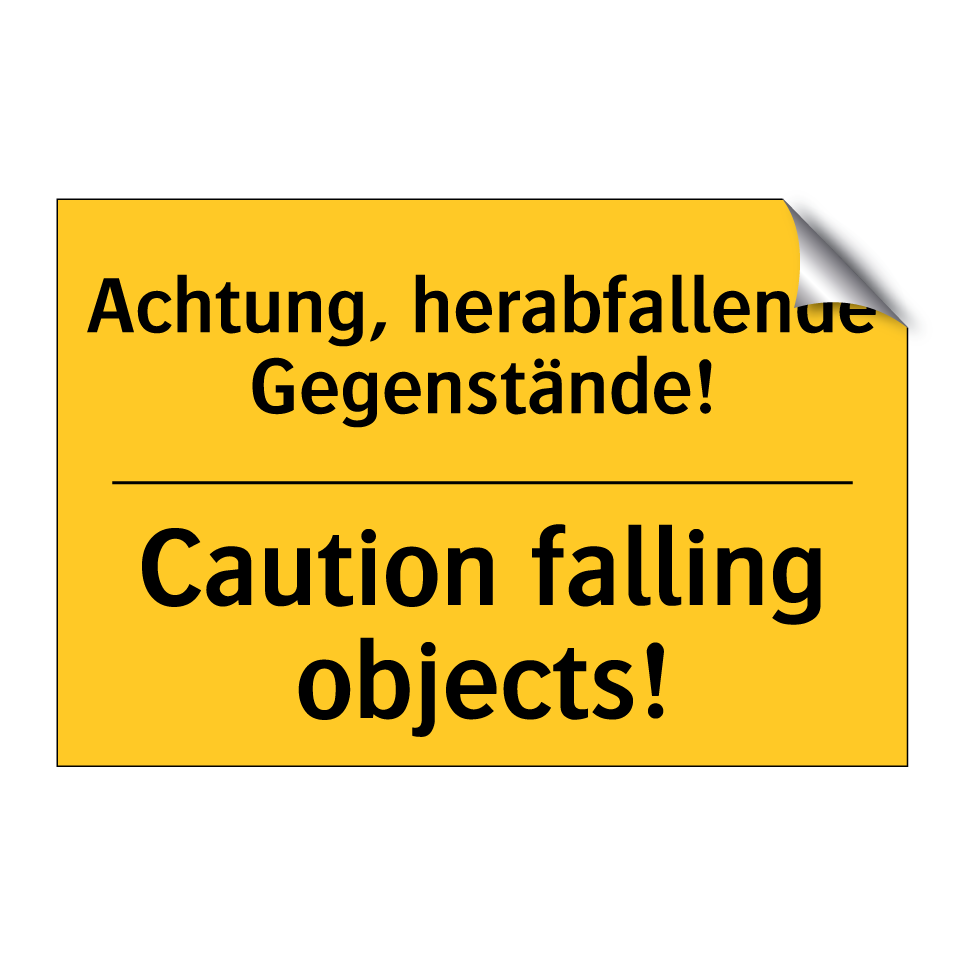 Zweisprachiges Warnschild mit deutschem Text Achtung, herabfallende Gegenstände! und englischem Text Caution falling objects!