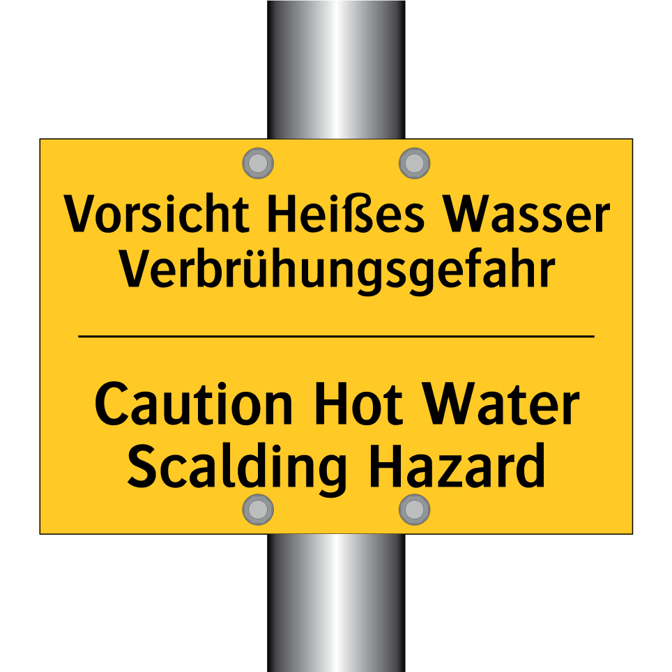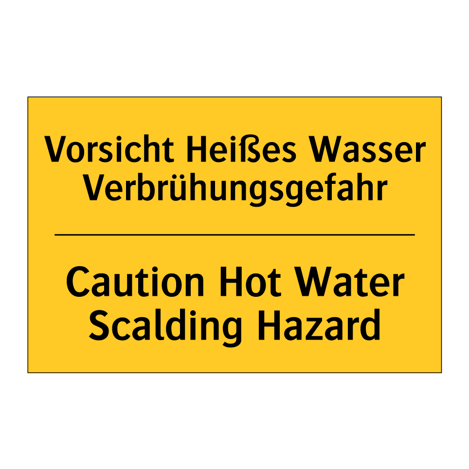 Zweisprachiges Warnschild mit deutschem Text Vorsicht Heißes Wasser Verbrühungsgefahr und englischem Text Caution Hot Water Scalding Hazard