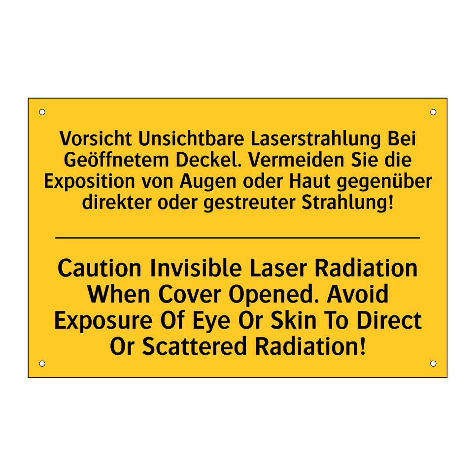 Zweisprachiges Warnschild mit deutschem Text Vorsicht Unsichtbare Laserstrahlung Bei Geöffnetem Deckel. Vermeiden Sie die Exposition von Augen oder Haut gegenüber direkter oder gestreuter Strahlung! und englischem Text Caution Invisible Laser Radiation When Cover Opened. Avoid Exposure Of Eye Or Skin To Direct Or Scattered Radiation!