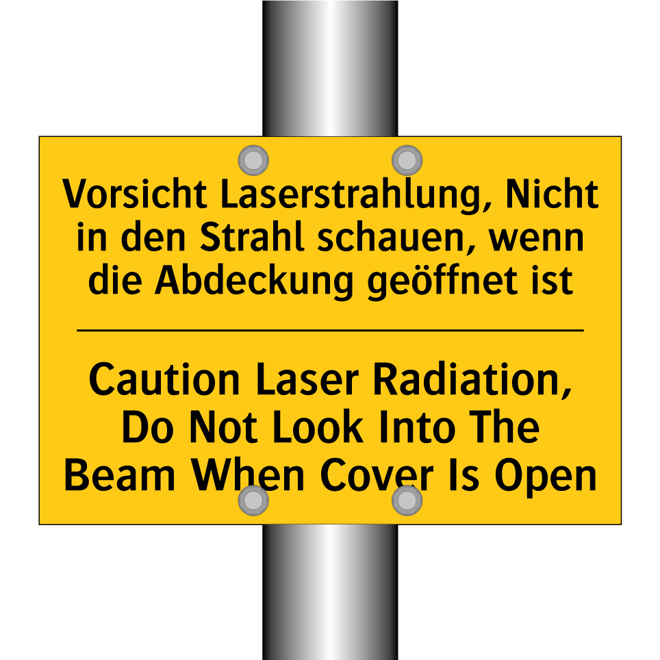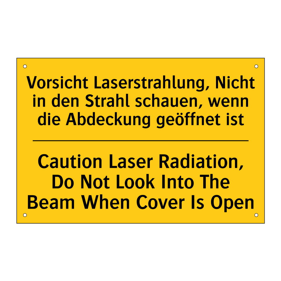 Zweisprachiges Warnschild mit deutschem Text Vorsicht Laserstrahlung, Nicht in den Strahl schauen, wenn die Abdeckung geöffnet ist und englischem Text Caution Laser Radiation, Do Not Look Into The Beam When Cover Is Open