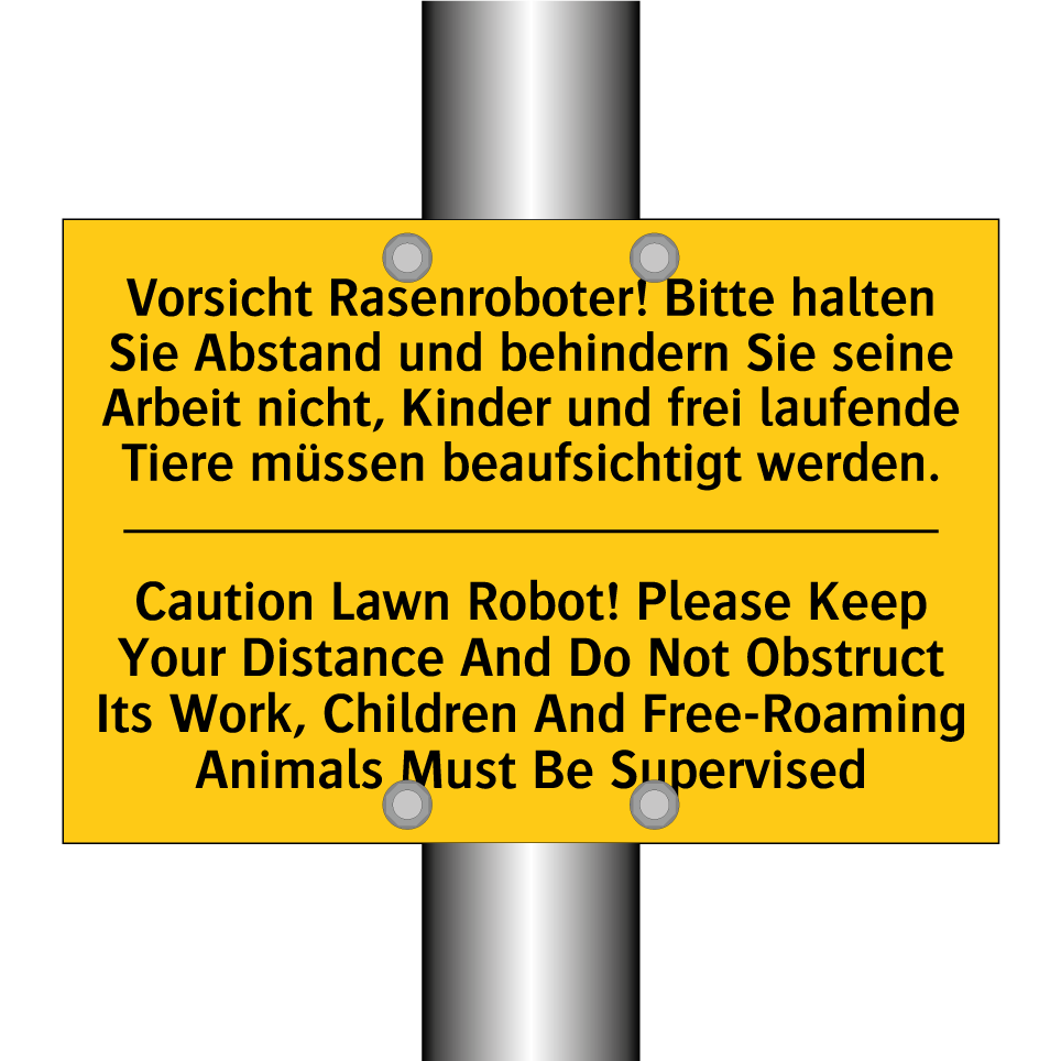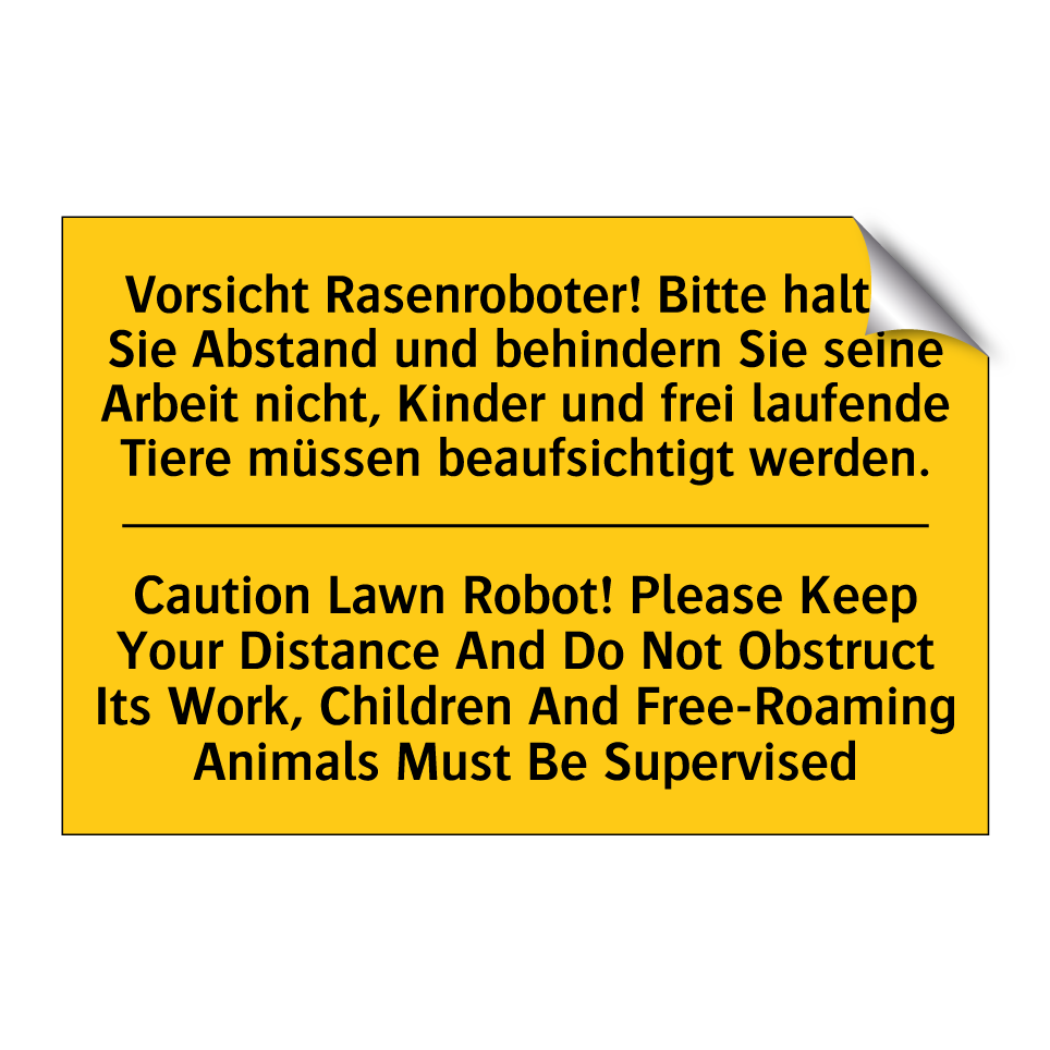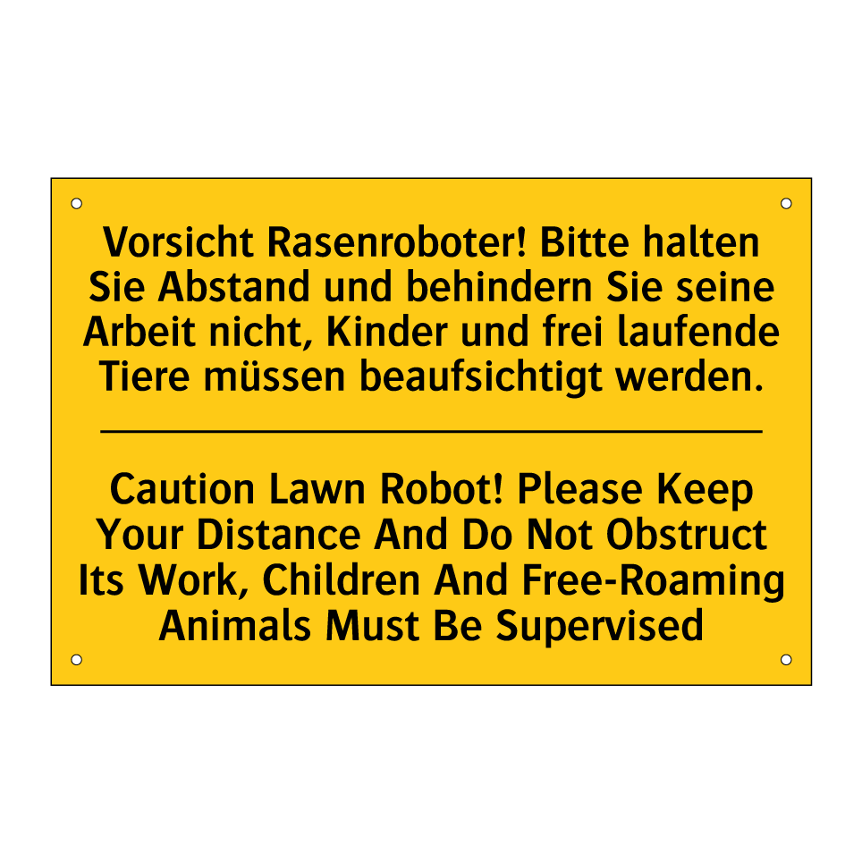 Zweisprachiges Warnschild mit deutschem Text Vorsicht Rasenroboter! Bitte halten Sie Abstand und behindern Sie seine Arbeit nicht, Kinder und frei laufende Tiere müssen beaufsichtigt werden. und englischem Text Caution Lawn Robot! Please Keep Your Distance And Do Not Obstruct Its Work, Children And Free-Roaming Animals Must Be Supervised