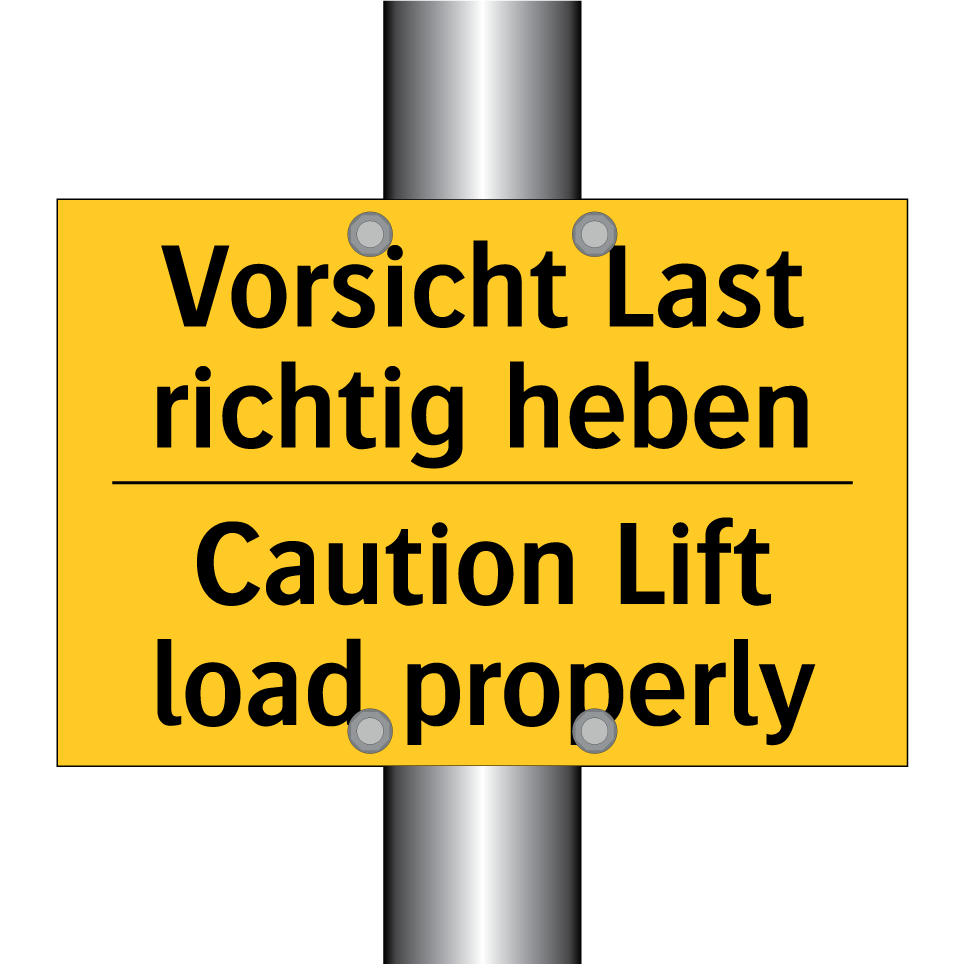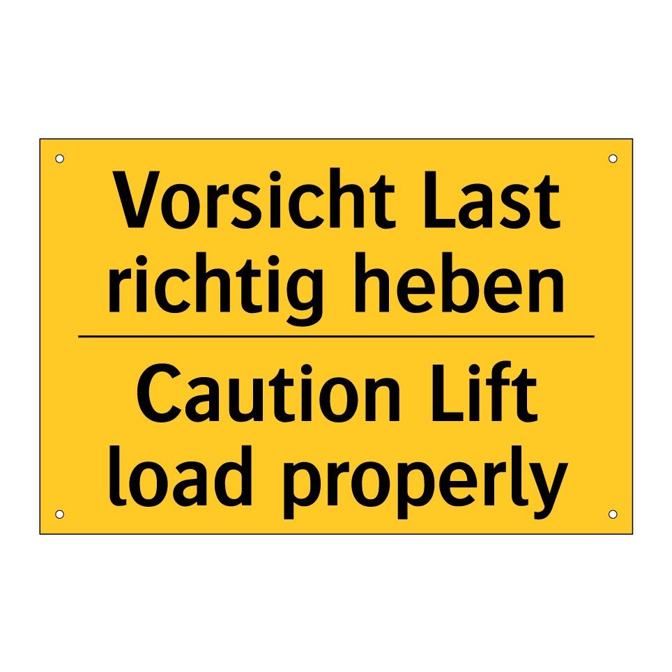 Zweisprachiges Warnschild mit deutschem Text Vorsicht Last richtig heben und englischem Text Caution Lift load properly