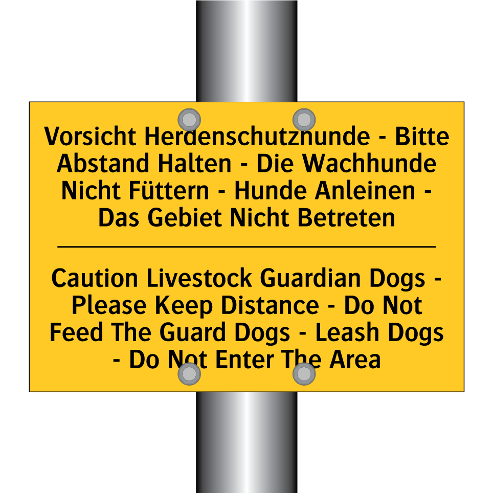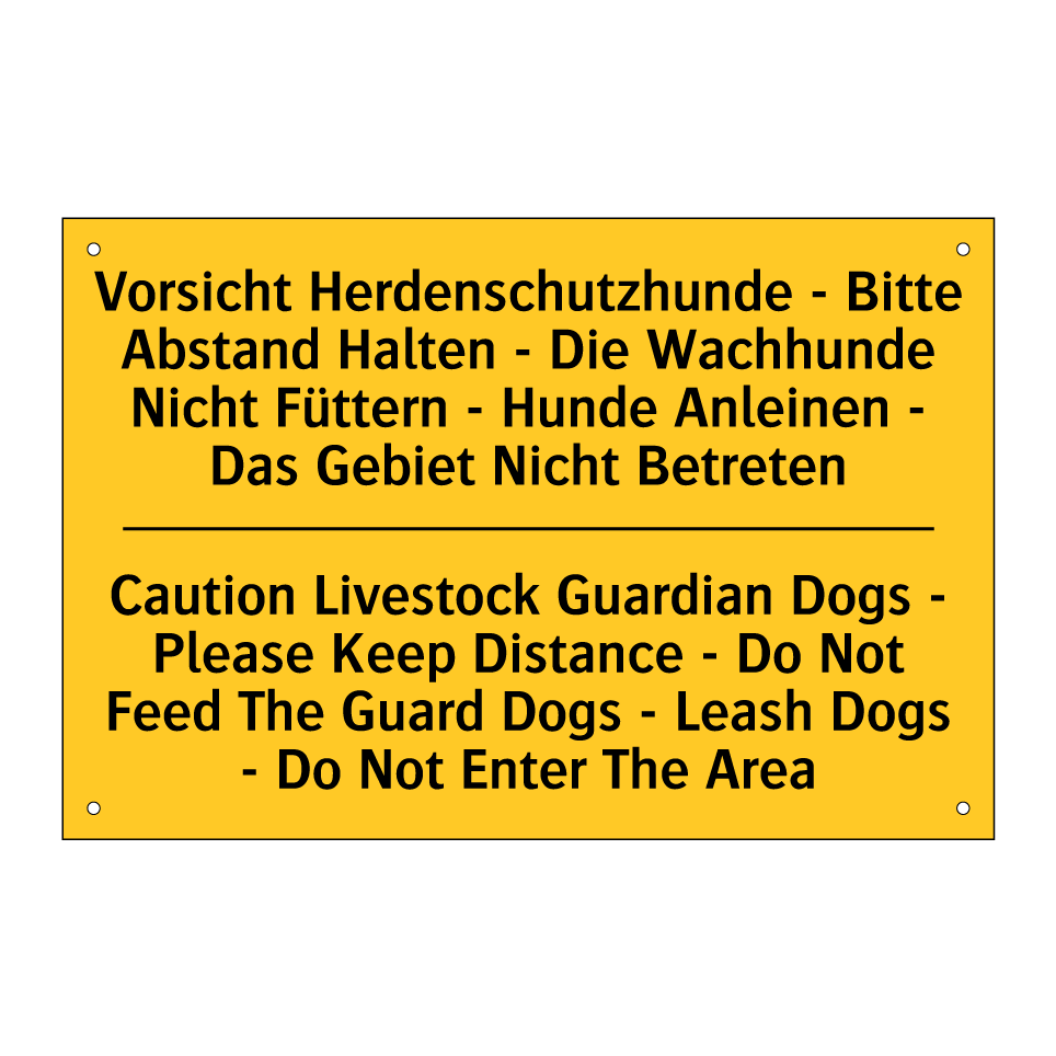 Zweisprachiges Warnschild mit deutschem Text Vorsicht Herdenschutzhunde - Bitte Abstand Halten - Die Wachhunde Nicht Füttern - Hunde Anleinen - Das Gebiet Nicht Betreten und englischem Text Caution Livestock Guardian Dogs - Please Keep Distance - Do Not Feed The Guard Dogs - Leash Dogs - Do Not Enter The Area