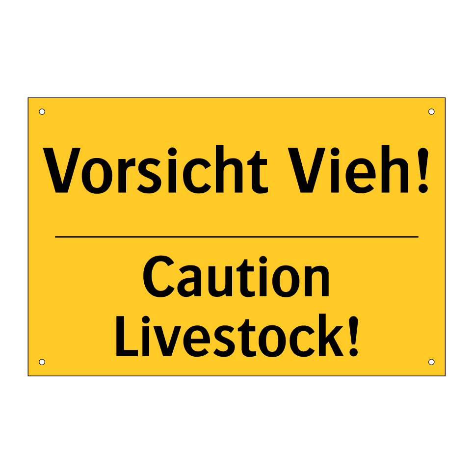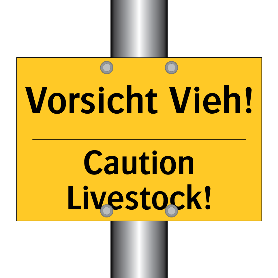 Zweisprachiges Warnschild mit deutschem Text Vorsicht Vieh! und englischem Text Caution Livestock!