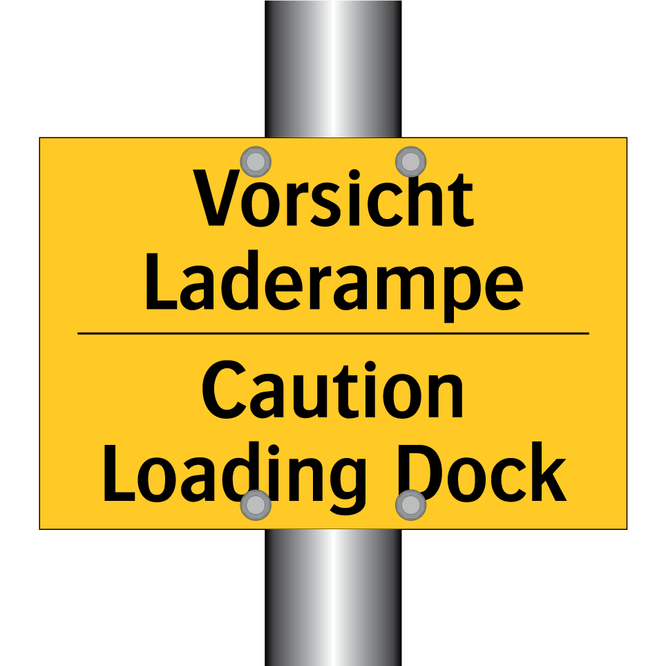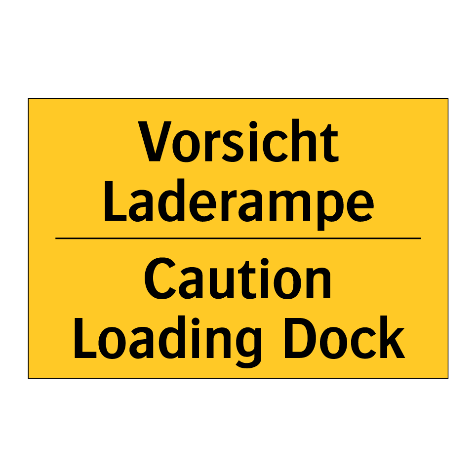 Zweisprachiges Warnschild mit deutschem Text Vorsicht Laderampe und englischem Text Caution Loading Dock