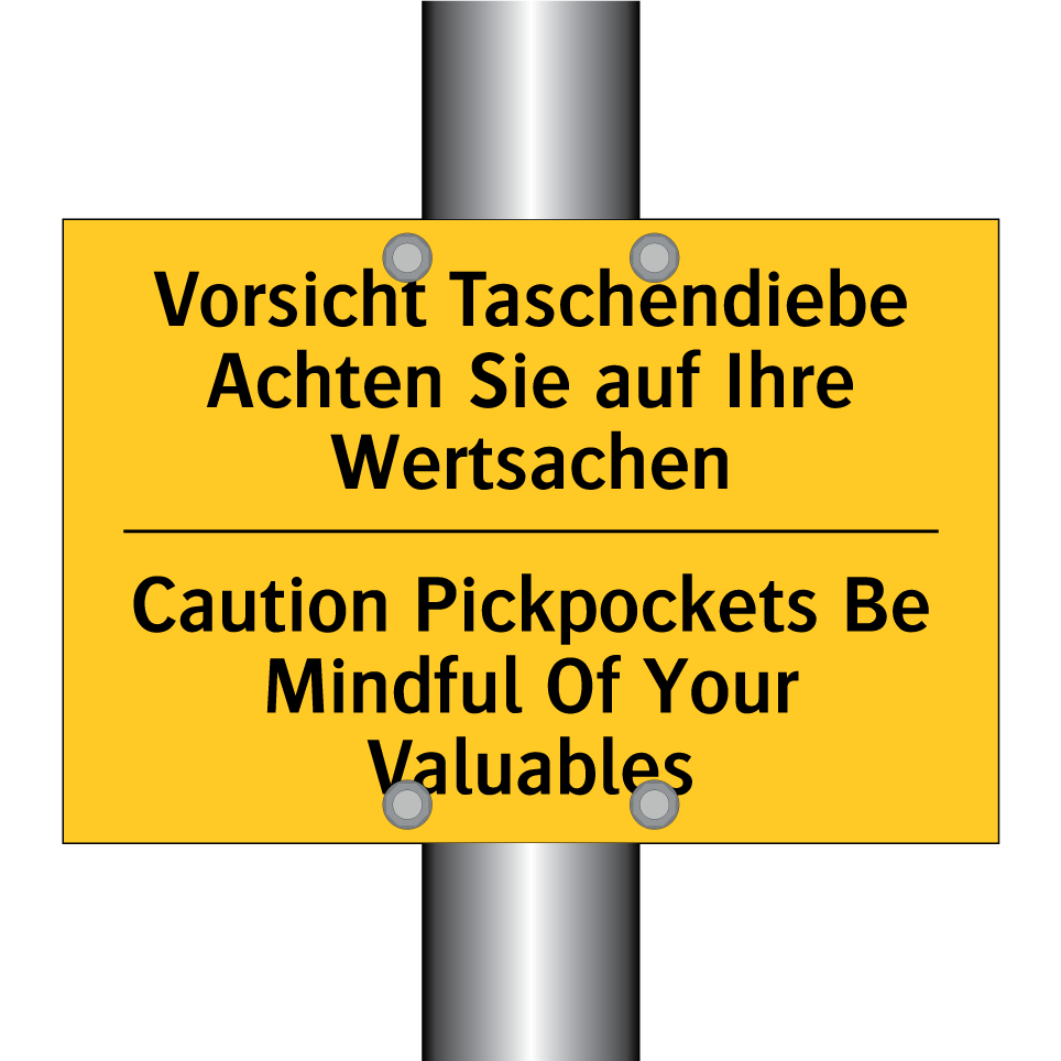 Zweisprachiges Warnschild mit deutschem Text Vorsicht Taschendiebe Achten Sie auf Ihre Wertsachen und englischem Text Caution Pickpockets Be Mindful Of Your Valuables