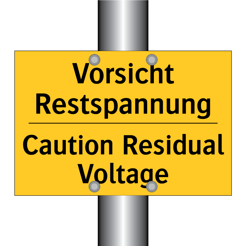 Zweisprachiges Warnschild mit deutschem Text Vorsicht Restspannung und englischem Text Caution Residual Voltage