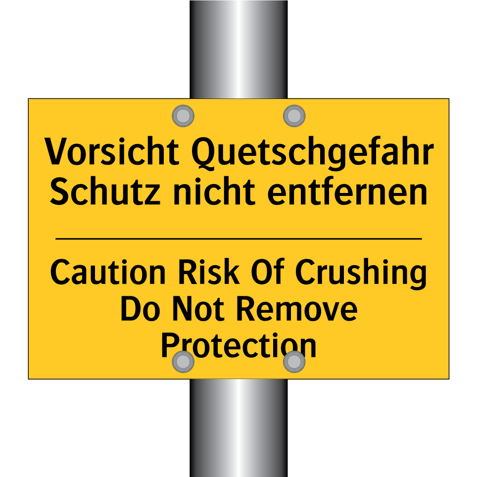 Zweisprachiges Warnschild mit deutschem Text Vorsicht Quetschgefahr Schutz nicht entfernen und englischem Text Caution Risk Of Crushing Do Not Remove Protection