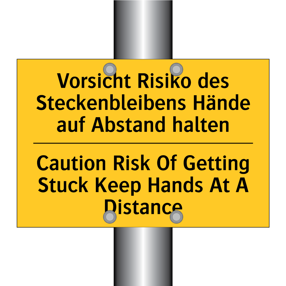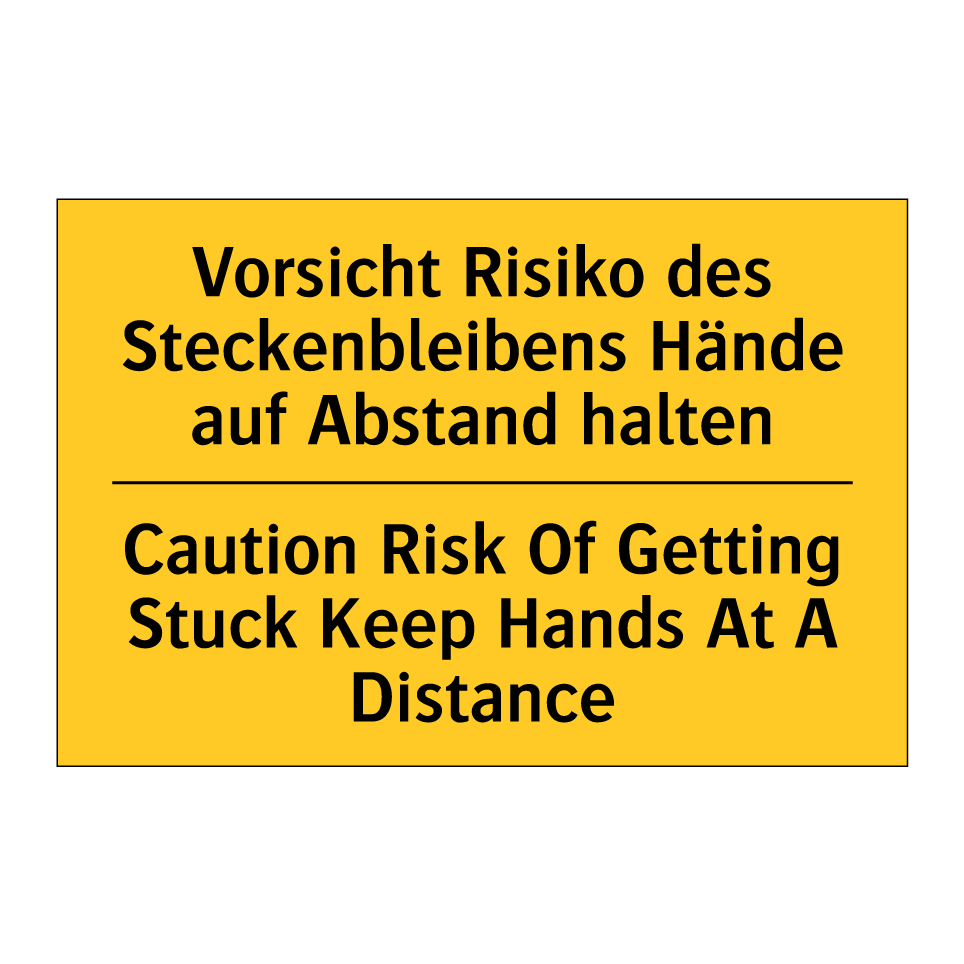 Zweisprachiges Warnschild mit deutschem Text Vorsicht Risiko des Steckenbleibens Hände auf Abstand halten und englischem Text Caution Risk Of Getting Stuck Keep Hands At A Distance