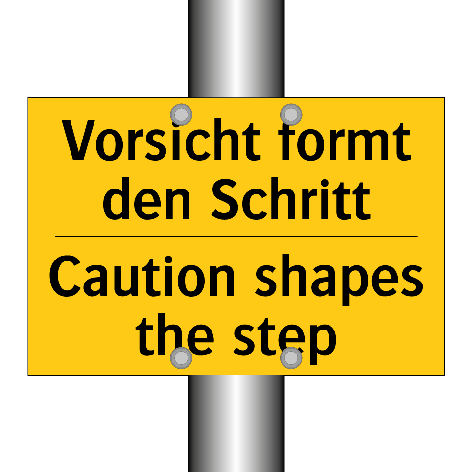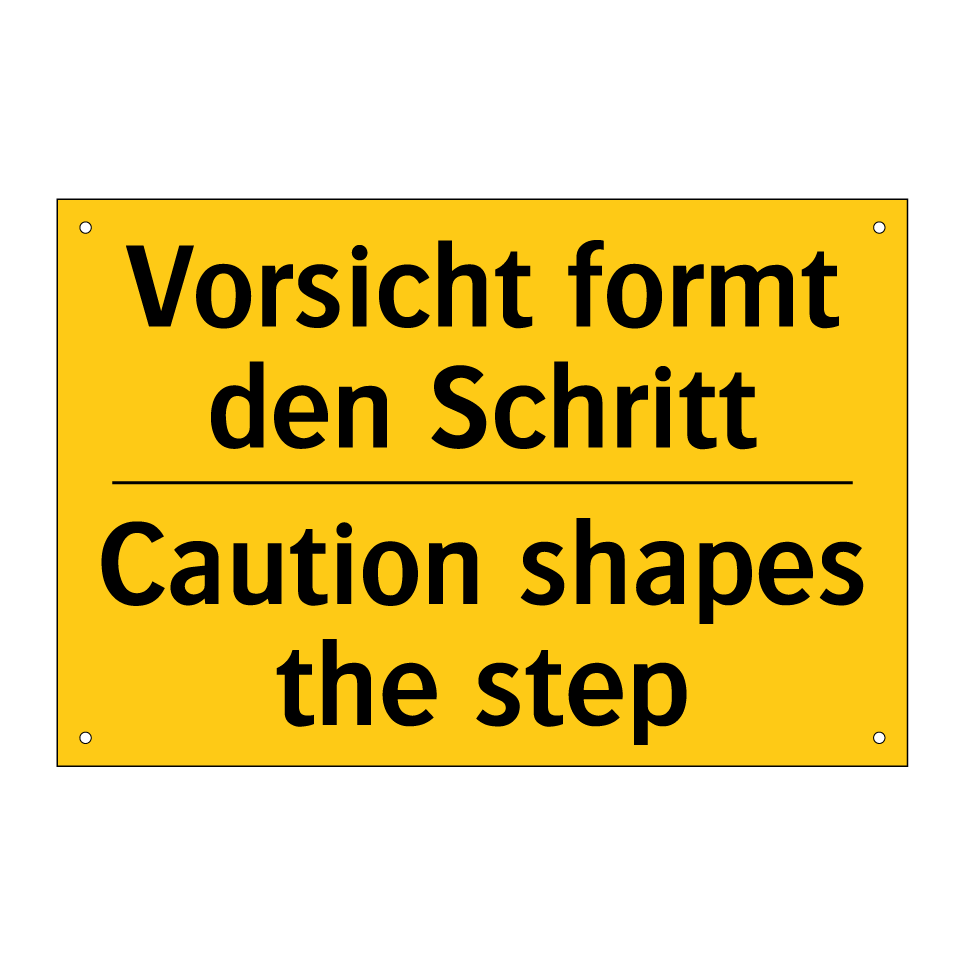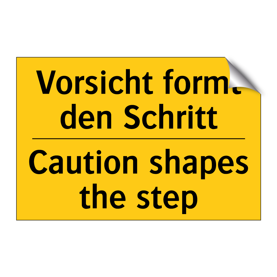 Zweisprachiges Warnschild mit deutschem Text Vorsicht formt den Schritt und englischem Text Caution shapes the step