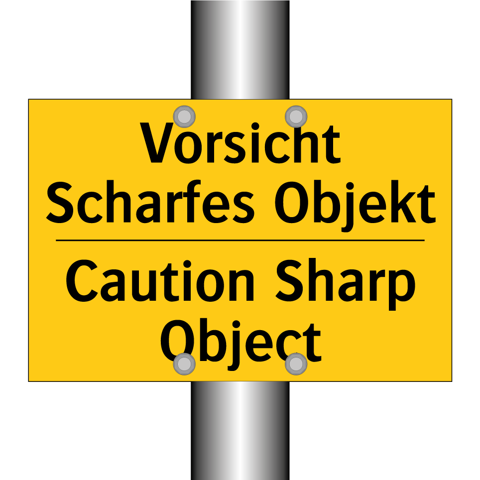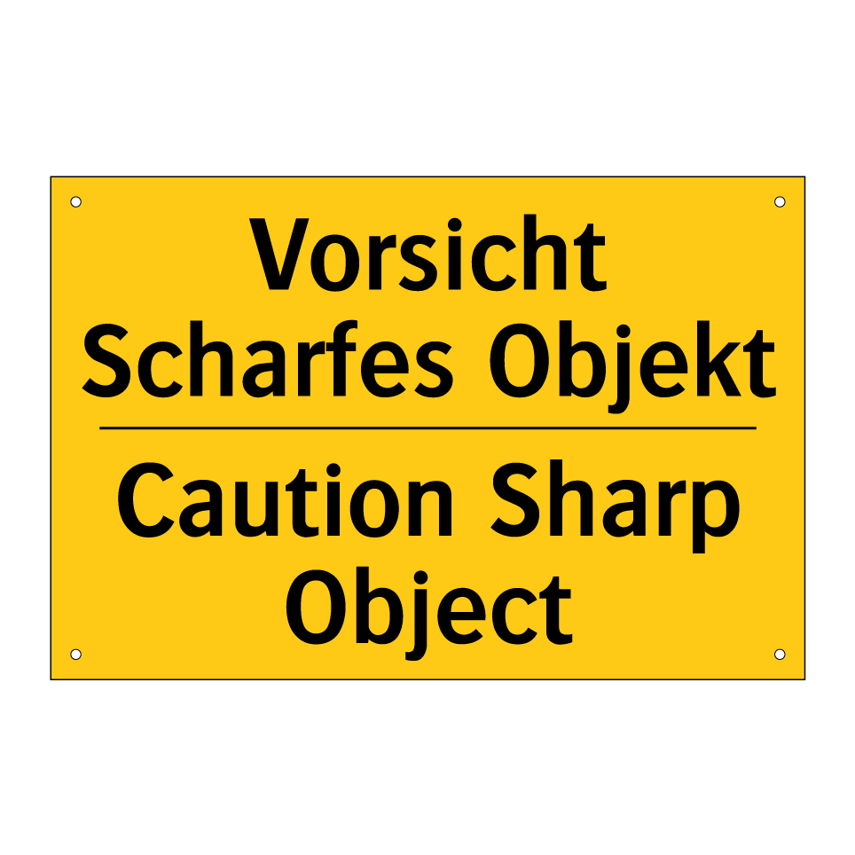 Zweisprachiges Warnschild mit deutschem Text Vorsicht Scharfes Objekt und englischem Text Caution Sharp Object