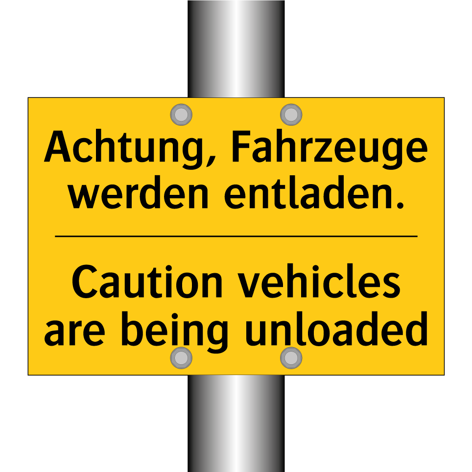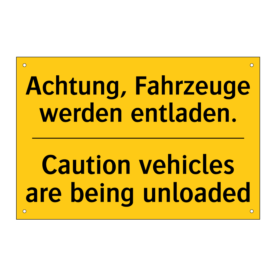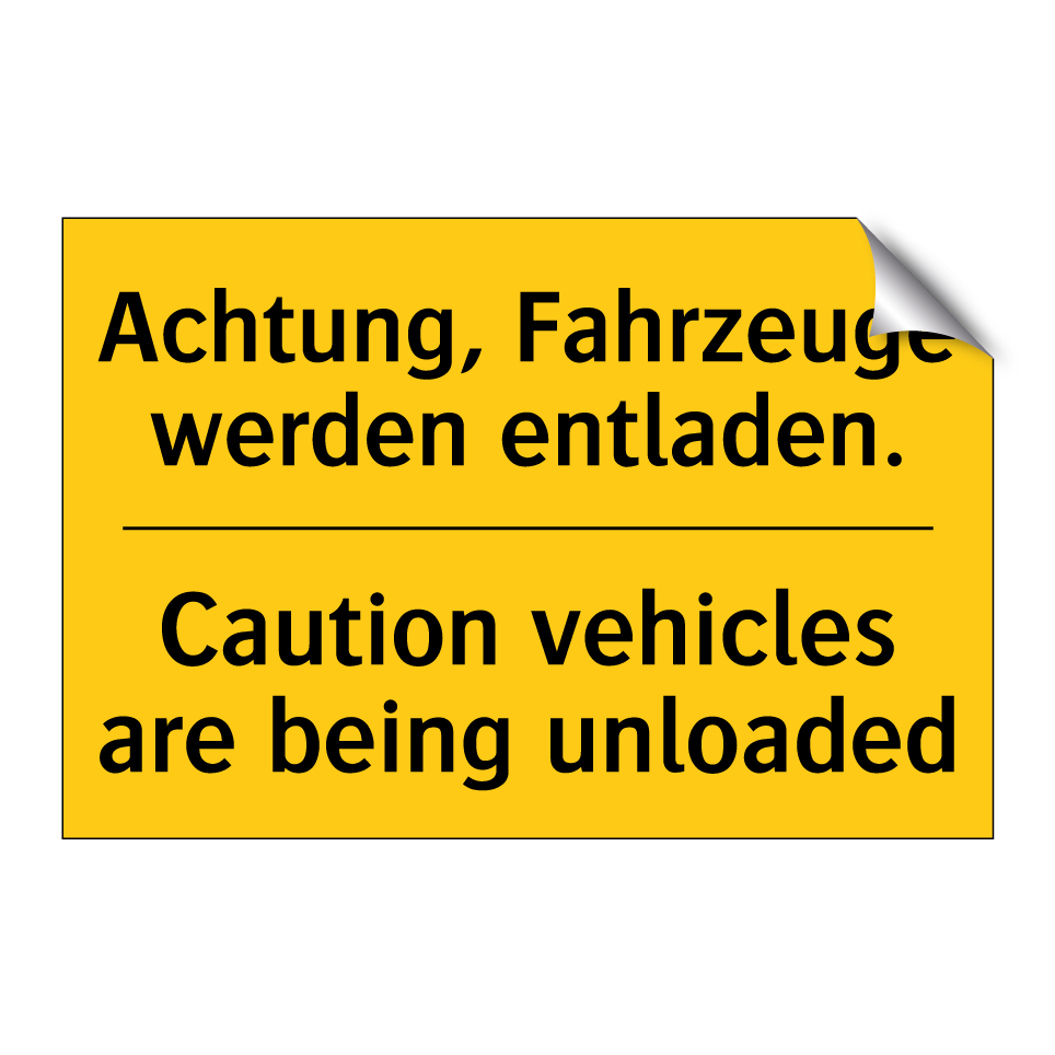 Zweisprachiges Warnschild mit deutschem Text Achtung, Fahrzeuge werden entladen. und englischem Text Caution vehicles are being unloaded