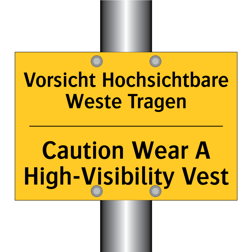 Diese auffällige Warnschild ist ideal für Arbeitsumgebungen, in denen Sicherheit oberste Priorität hat. Mit ihrer leuchtend gelben Hintergrundfarbe und der klaren schwarzen Schrift zieht sie sofort die Aufmerksamkeit auf sich und erinnert daran, eine gut sichtbare Weste zu tragen. Die zweisprachige Beschriftung auf Deutsch und Englisch sorgt dafür, dass sowohl lokale als auch internationale Mitarbeiter die wichtige Sicherheitsbotschaft verstehen. Diese Warnschilder sind besonders nützlich auf Baustellen, in Lagerhallen oder in Bereichen mit hohem Verkehrsaufkommen, wo das Tragen von Sicherheitswesten unerlässlich ist. Platzieren Sie die Warnschild an gut sichtbaren Stellen, um die Sicherheit und das Bewusstsein für Schutzmaßnahmen zu erhöhen.
