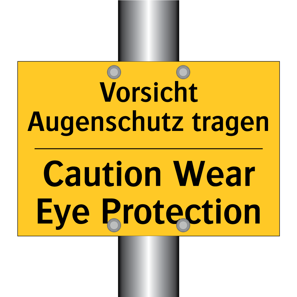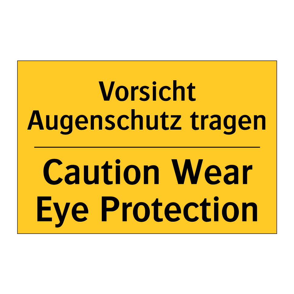 Zweisprachiges Warnschild mit deutschem Text Vorsicht Augenschutz tragen und englischem Text Caution Wear Eye Protection