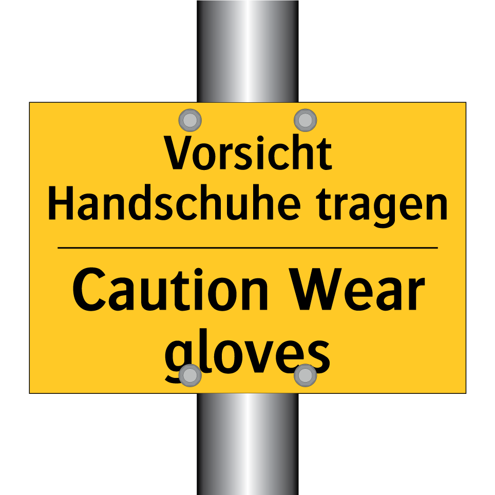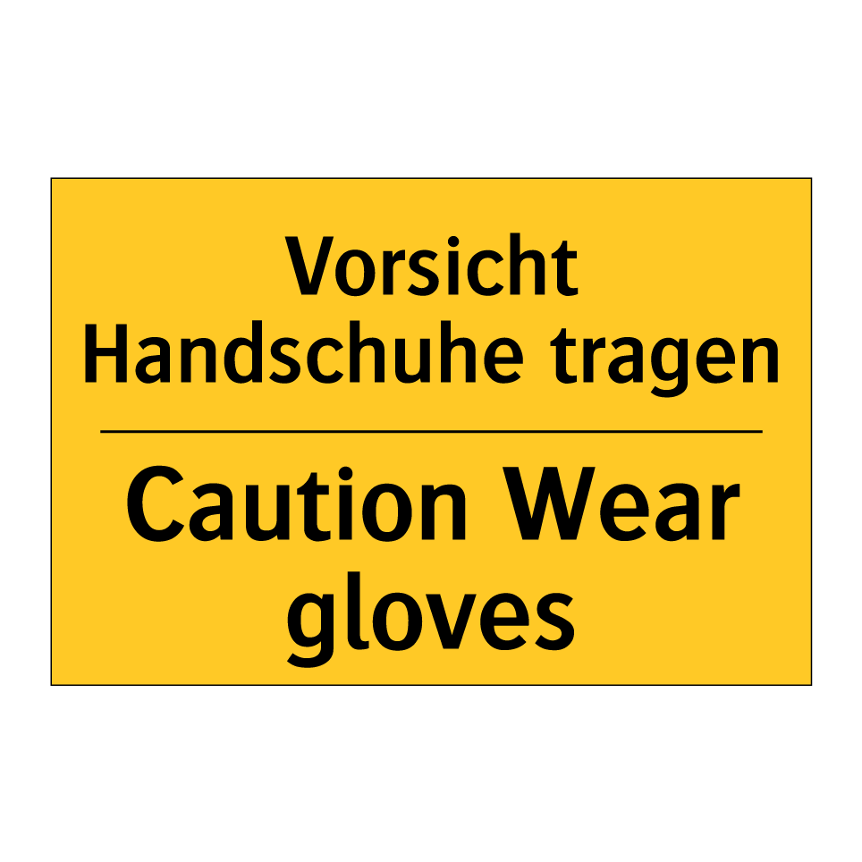 Zweisprachiges Warnschild mit deutschem Text Vorsicht Handschuhe tragen und englischem Text Caution Wear gloves