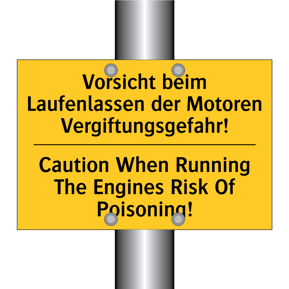 Zweisprachiges Warnschild mit deutschem Text Vorsicht beim Laufenlassen der Motoren Vergiftungsgefahr! und englischem Text Caution When Running The Engines Risk Of Poisoning!